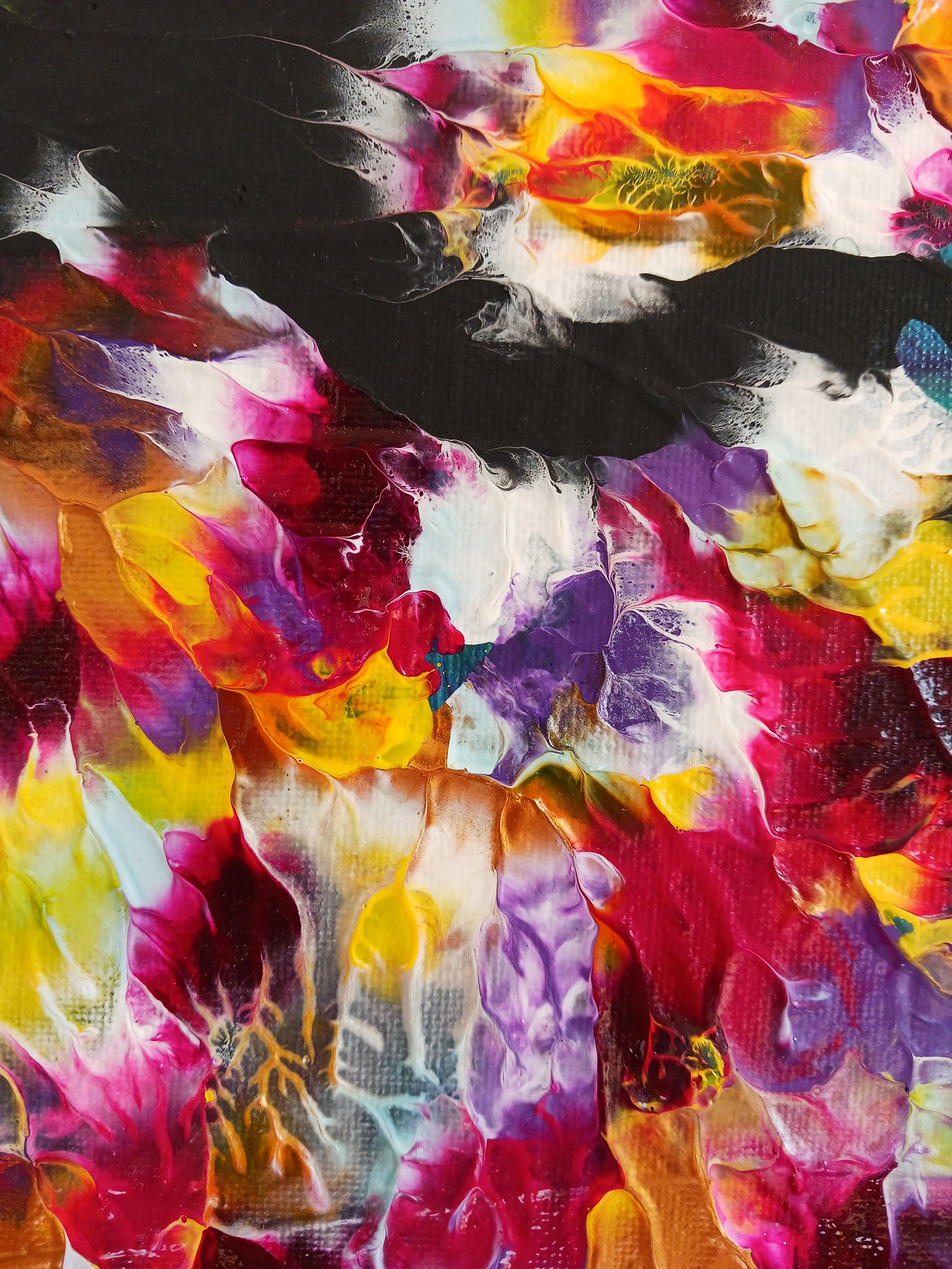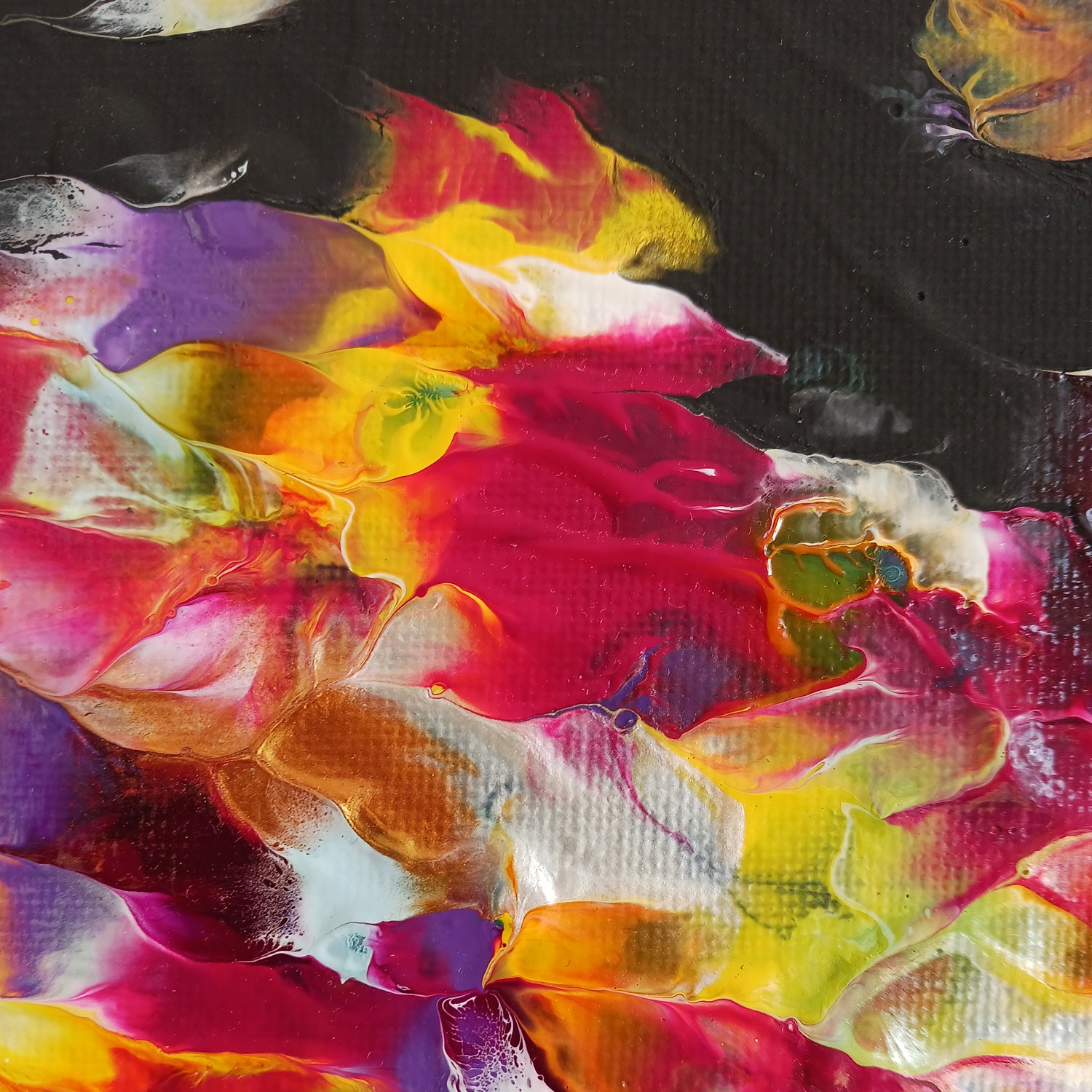 In this expressive abstract acrylic painting, the warm color palette featuring gold, fuchsia, magenta, and violet are contrasted by powerful black tree branches in a matte finish. The vibrant colors are a combination of high-quality iridescent and glossy acrylic paints, as well as gel stain and glaze, with unique textures incorporated throughout the artwork.Â