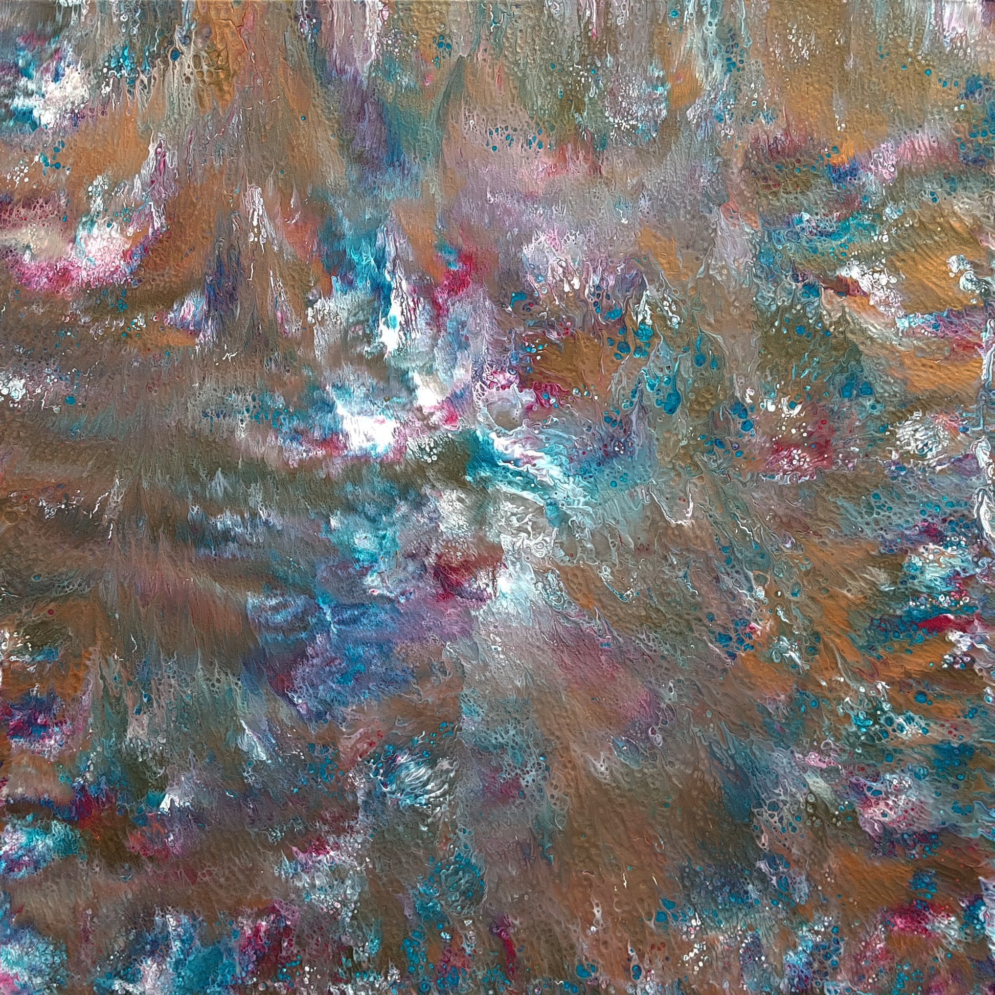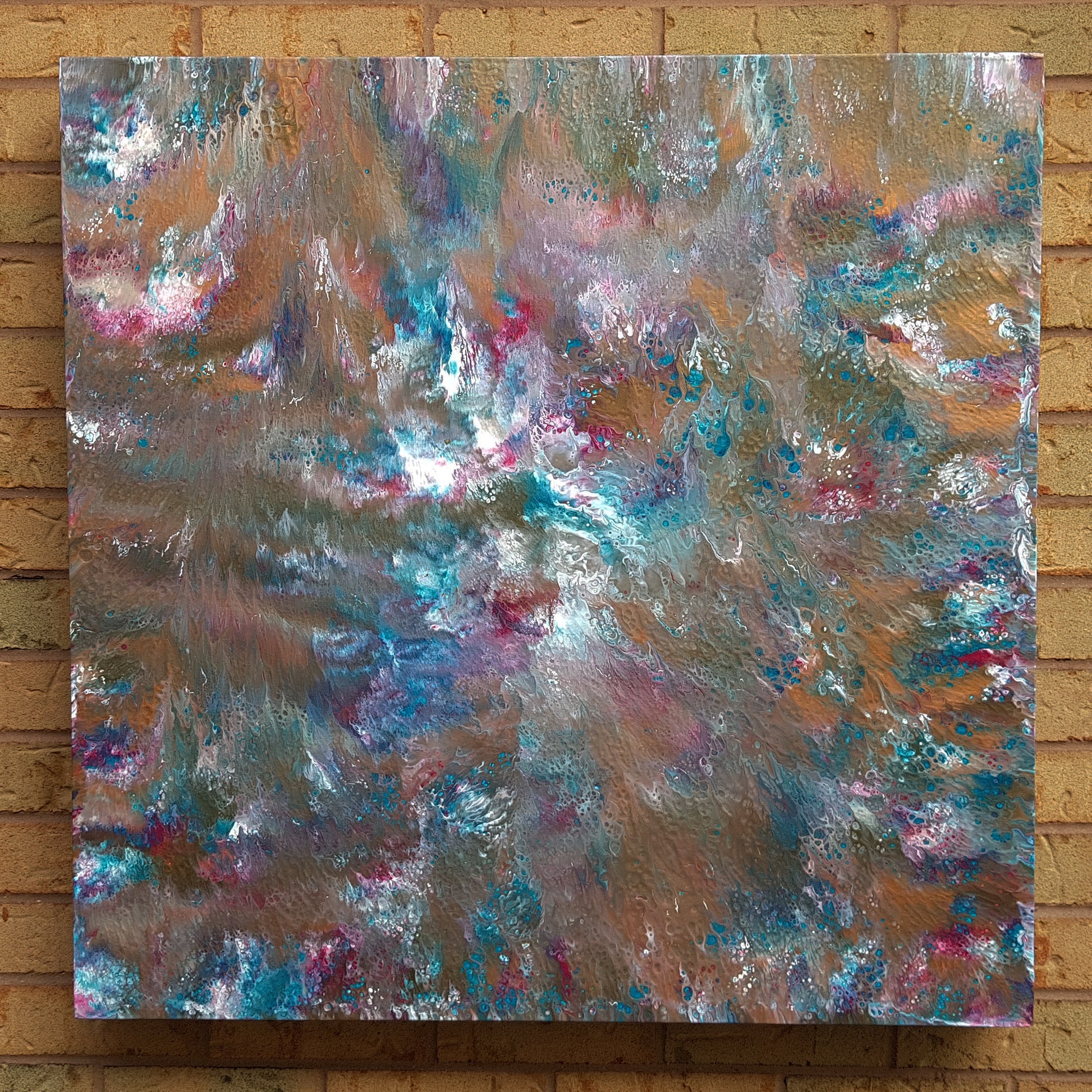 A beautiful abstract with movement, texture, and an amazing palette of magenta, refreshing turquoise, white, metallic copper, bronze, and silvery grey. Created on a wood canvas with 3-inch sides that are painted in a similar style to the front, which adds depth that lets the painting stand out boldly from all sides.