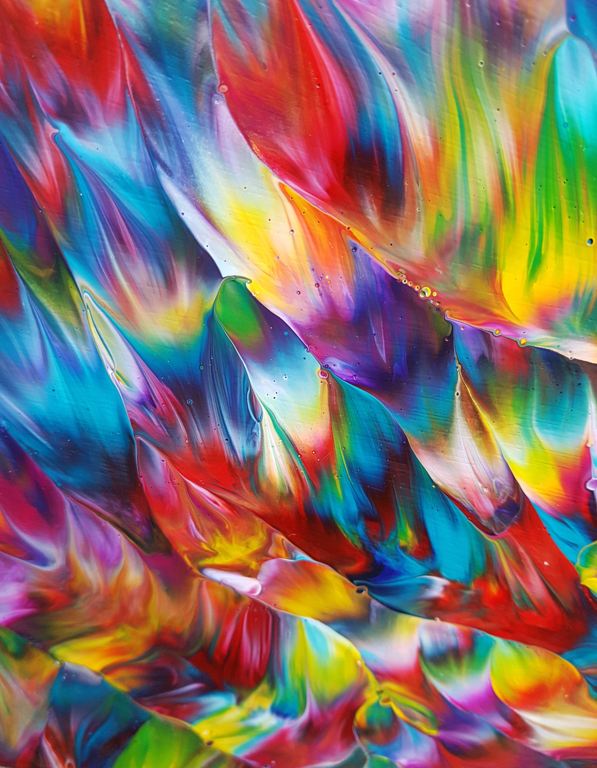 Birds of a Feather is an original, abstract expressionism painting with fabulous, bold, vibrant colours! The movement of the paint strokes represents beautiful tropical birds playing and freely flying in the sky. This painting has stunning texture and is painted on a custom made, deep edge wood canvas with the sides painted the same style as the front; giving a full wrap around look that stands out as a unique focal point.
