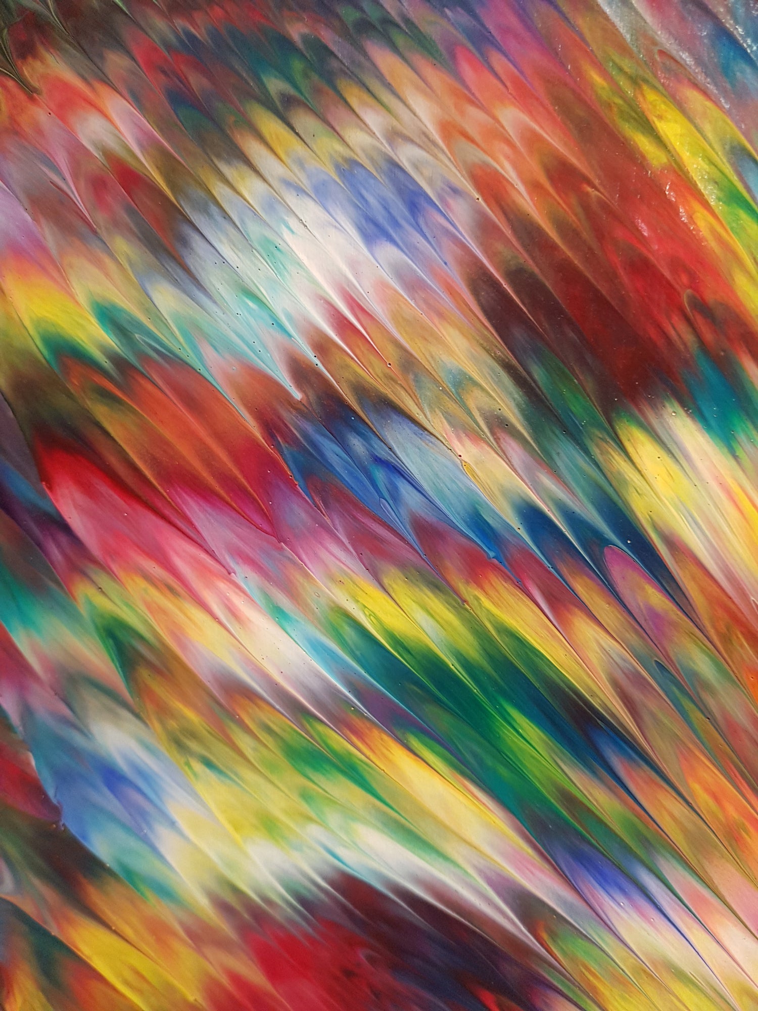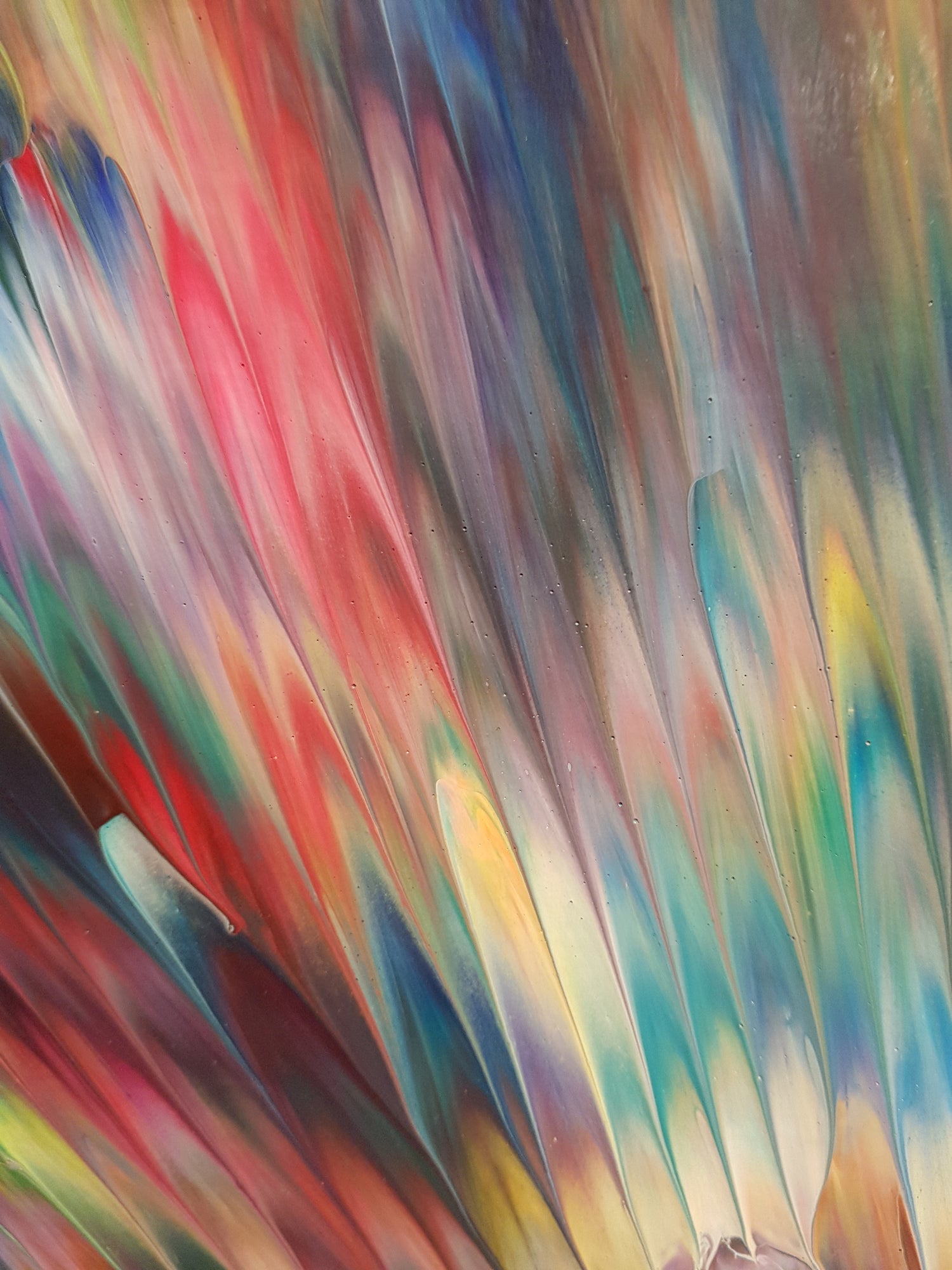 "Celestial Bloom" bursts with radiant energy, as if a flower of light were unfolding across the cosmos. Bold strokes and feathered textures spread outward in vibrant hues of gold, crimson, teal, and violet, creating a sense of both movement and stillness. The layered colors shimmer between harmony and contrast, drawing the viewer into a luminous, dreamlike space where nature and the celestial meet.