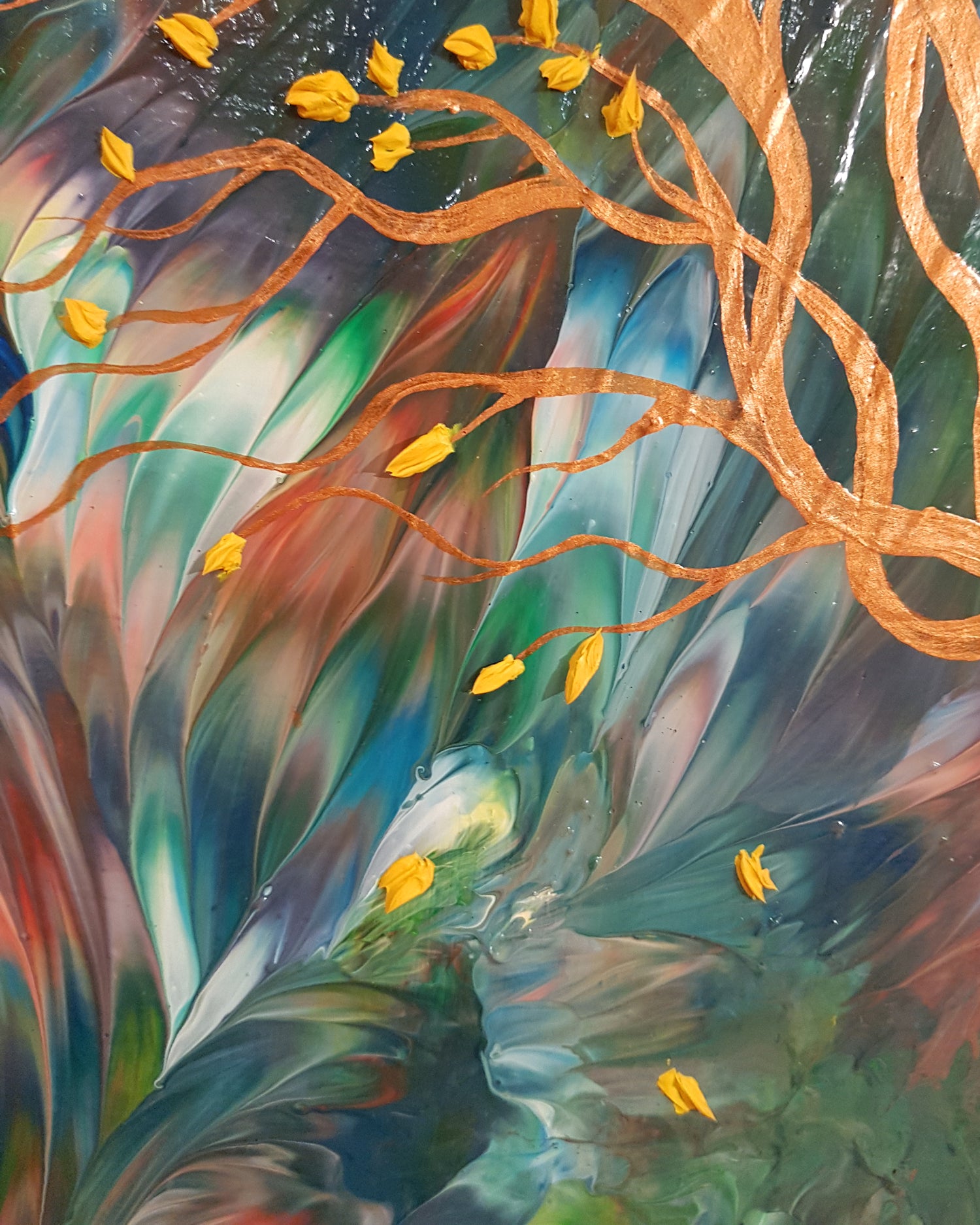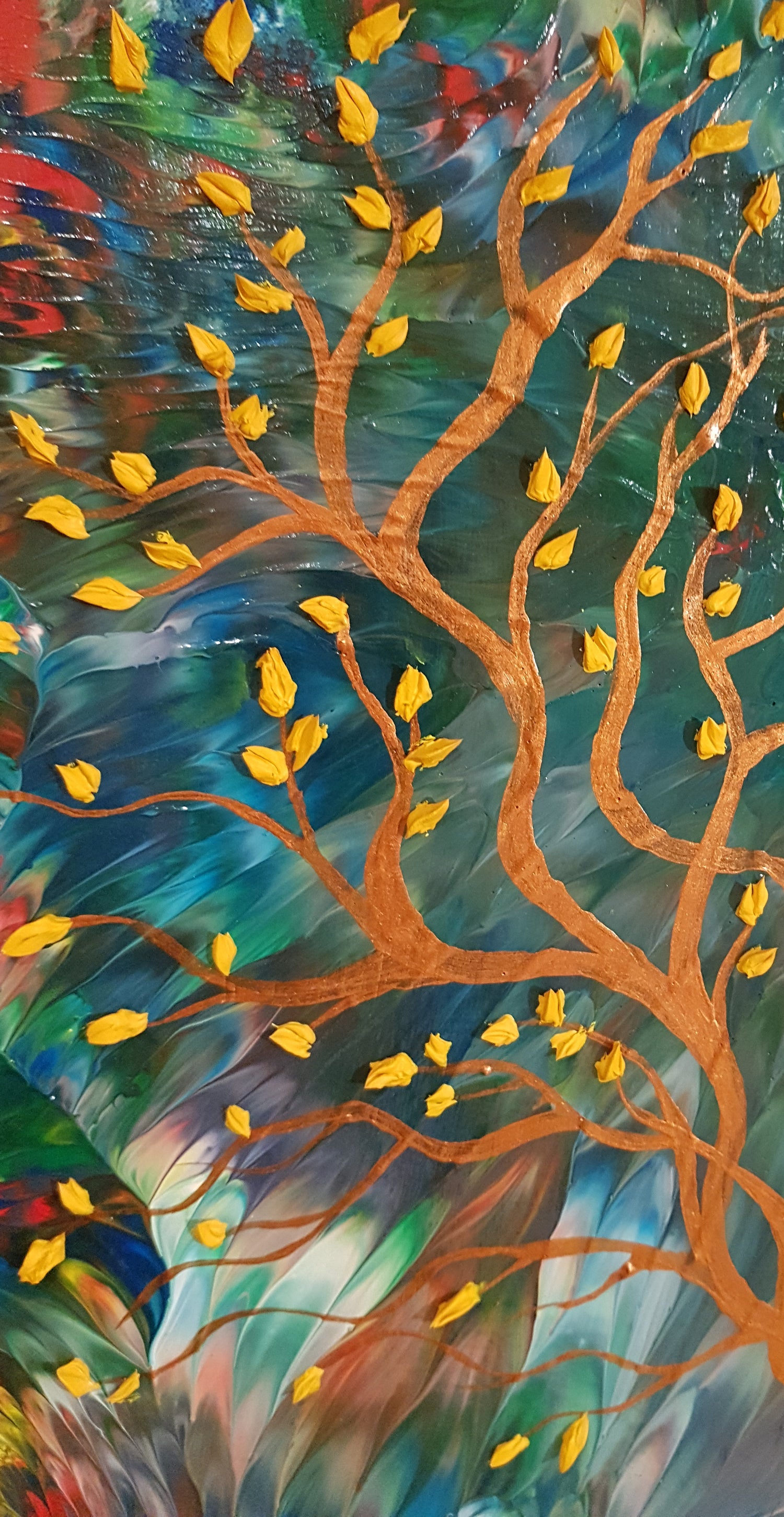 An expressive, unique painting features textured, yellow leaves created with thick oil paint that comes alive by adding depth ontop of the feathery styled sky, that's textured in a different way to capture elements of trees and the organic shapes in nature. Metallic copper enamel paint is used to create the tree trunk, branches and roots; the copper paint bounces in the light beautifully ontop of the acrylic painted background that has a gloss finish. The painting is created with a variety of high-quality paints and is one-of-a-kind since it's created on a custom-made wood canvas with 3 inch sides that are painted in the same style as the front with falling leaves, which makes the painting stunningly stand out from all viewing angles.Â