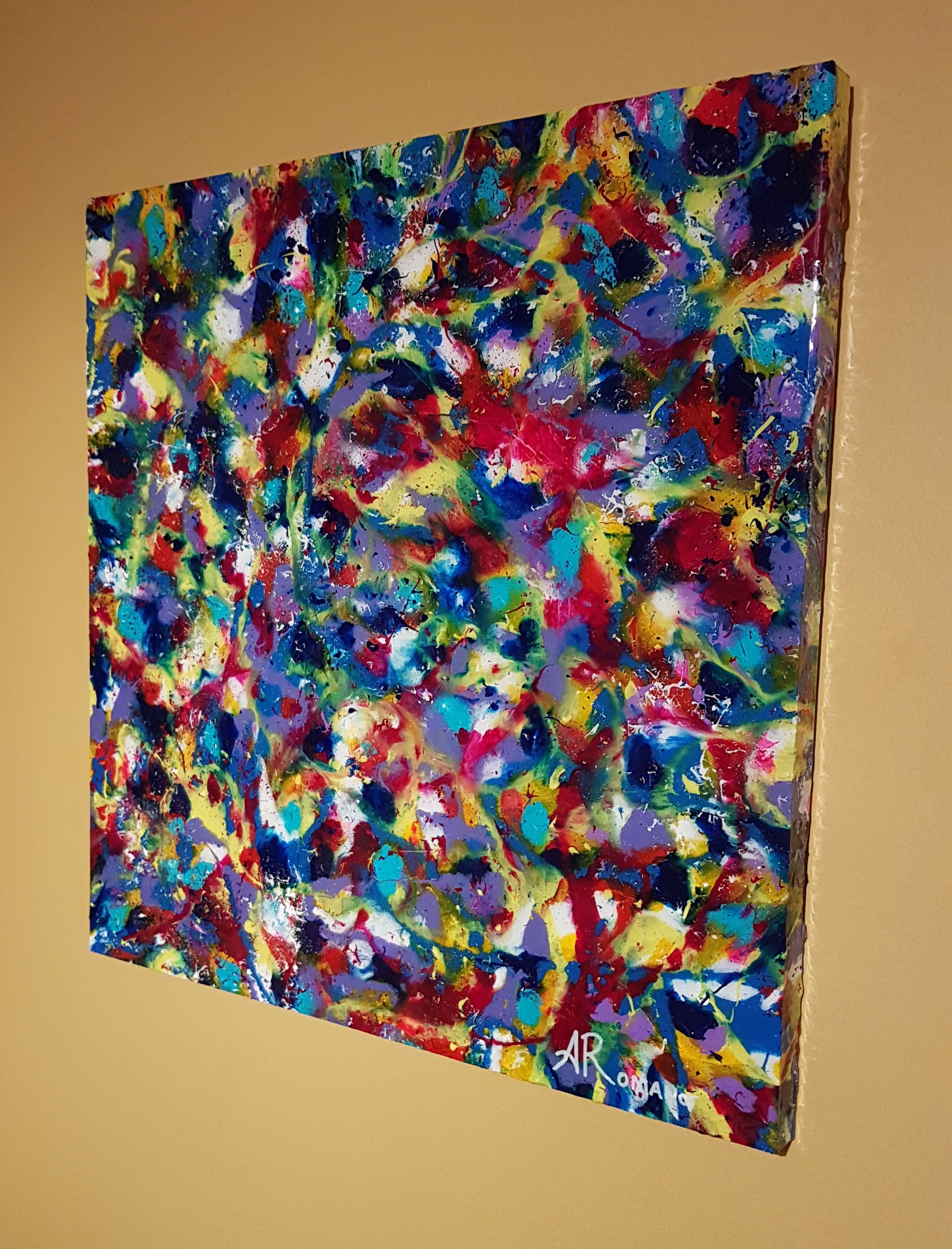 This bold painting with expressive shapes has a vibrant colour scheme and a high-gloss resin finish that makes it look incredibly shiny. As a result of the resin finish, the colours are more vivid and the sides are painted the same way as they are on the front, giving the surface a full wrap-around look that is visually appealing from all angles. Nature's vivid hues were the inspiration for this piece, which has amazing textures.