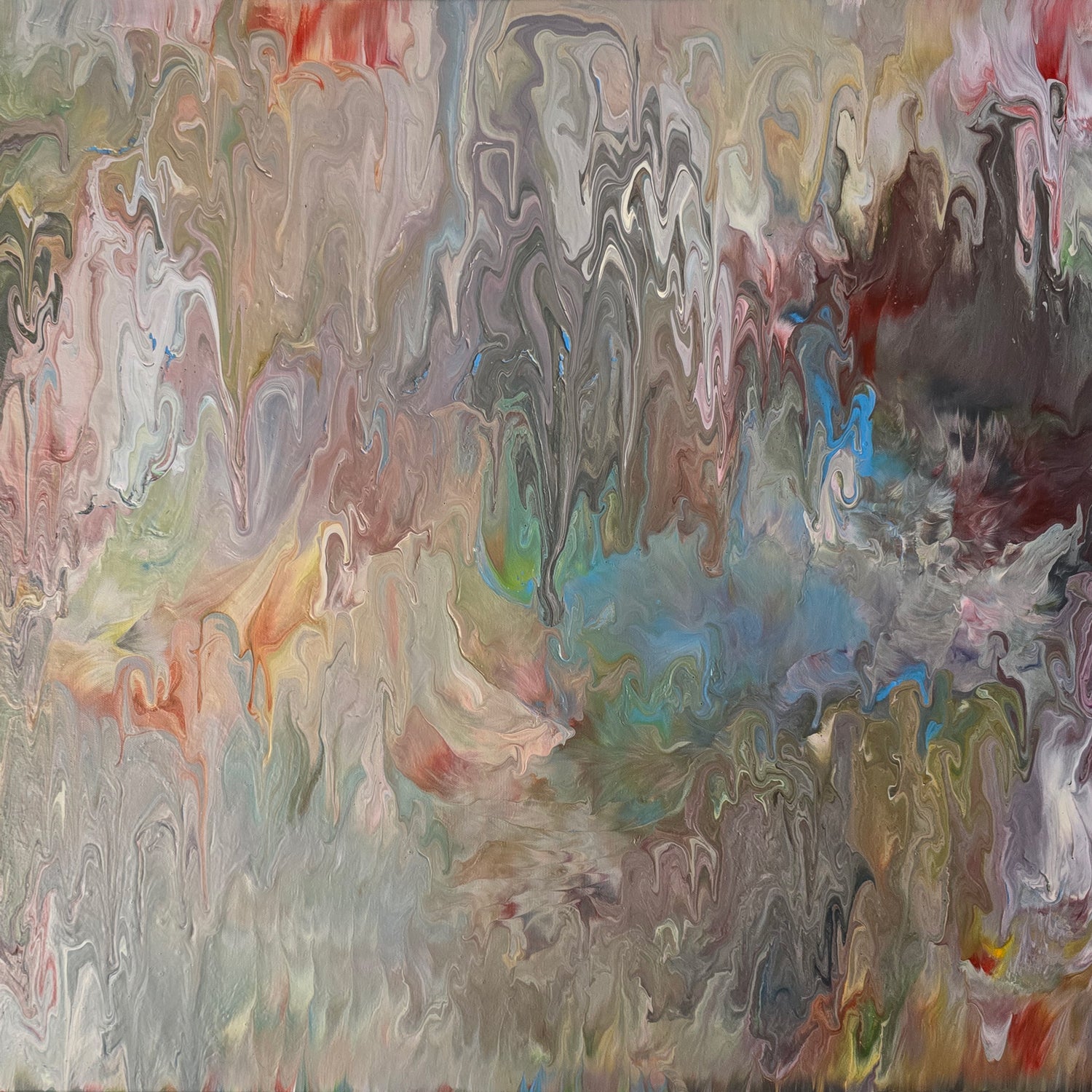 An abstract expressionism painting evoking the power of creation, 'Divine Mother' is a large, unique painting. Grey, pink, white, and violet are muted tones that represent the nurturing beauty of mother nature juxtaposed with bold dark gray, representing her destructive and fierce nature.