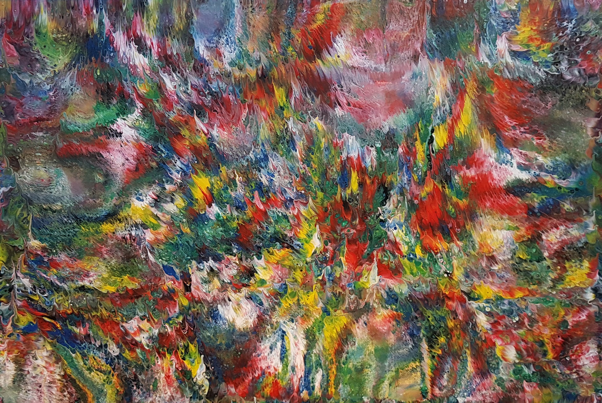 Epic Battle is a bold painting with vibrant colours; red, yellow, green, blue, and white fiercely play off of each other in this original abstract expressionism painting; a one-of-a-kind statement piece created with fierce brush strokes exploding from a central focal point. This large abstract is created on a custom-made wood canvas with thick 3-inch sides which makes this unique painting really stand out.