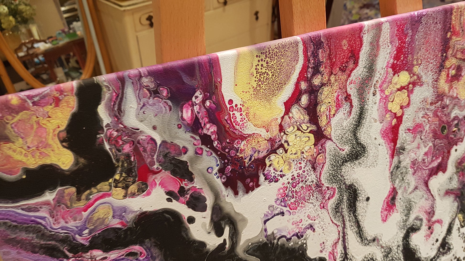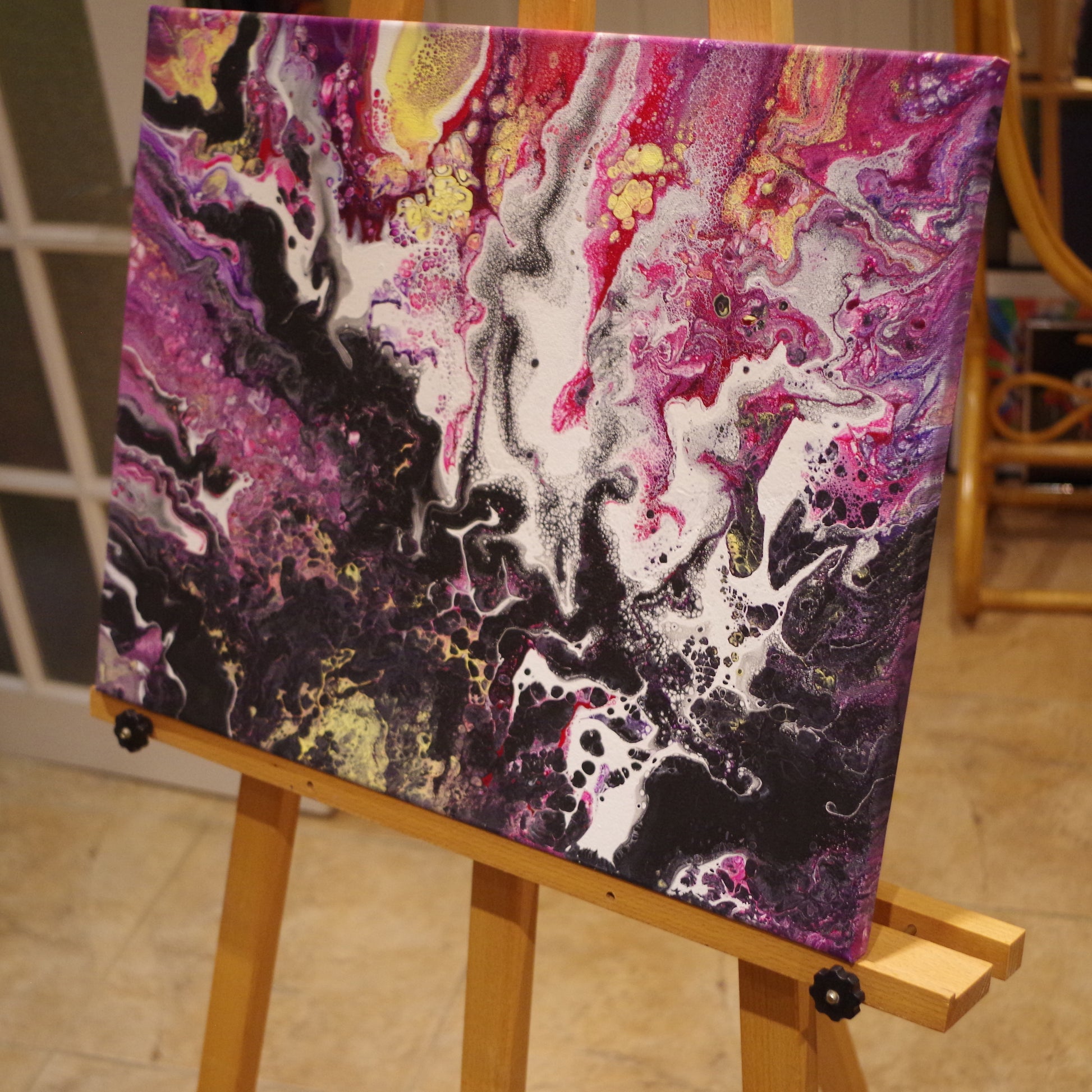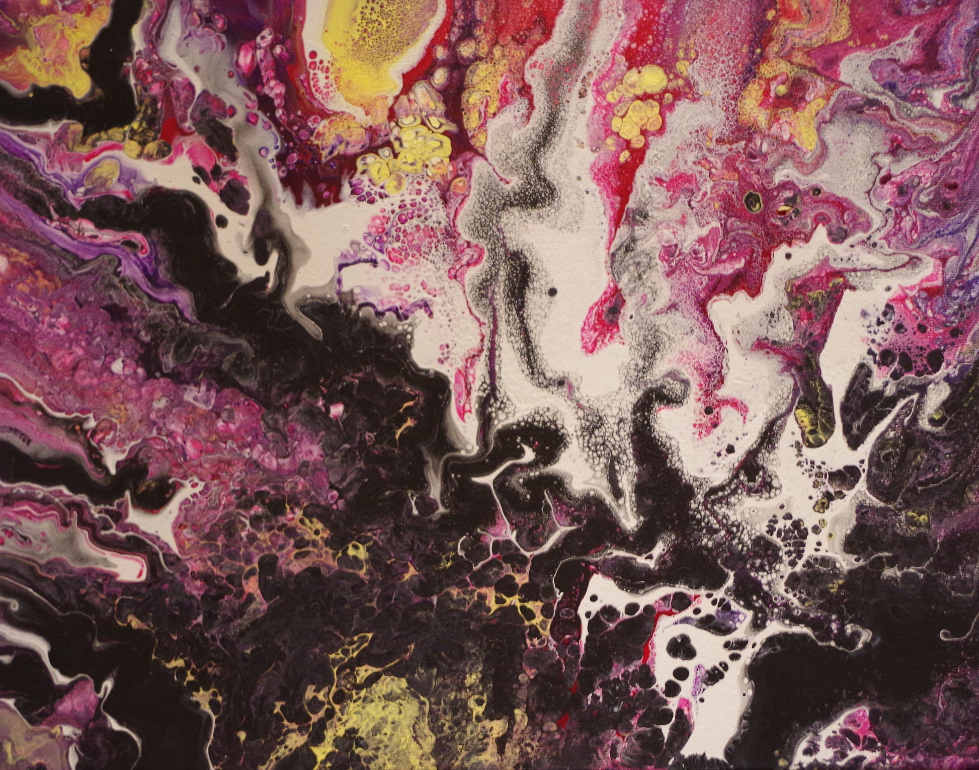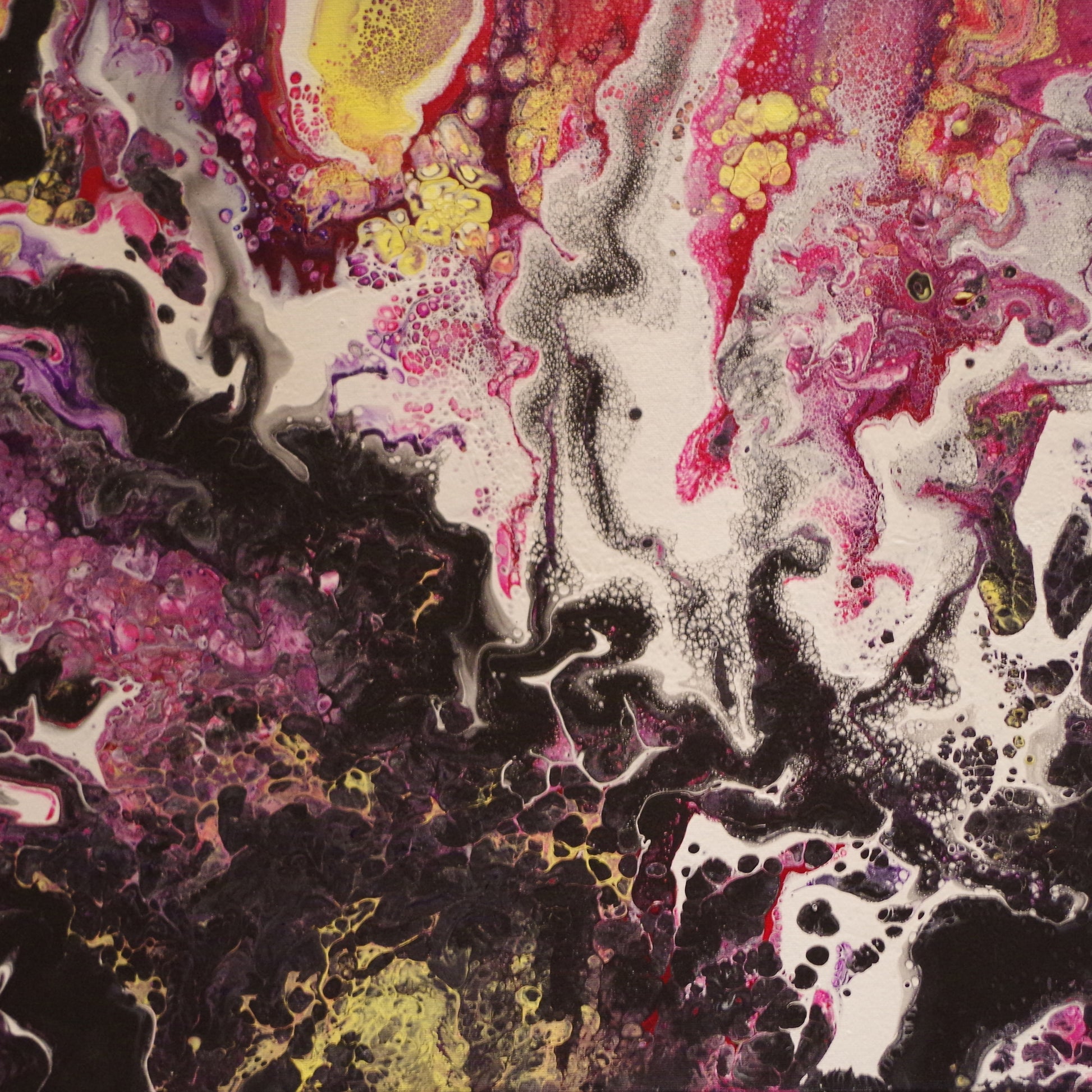 "Evolution: a single cell from dark to light" is an original abstract painting of an amoeba cell altering its shape. Features stunning details of cellular forms in black and white; a battle between light and dark forces. Magenta, pink and purple compliments the yellow.