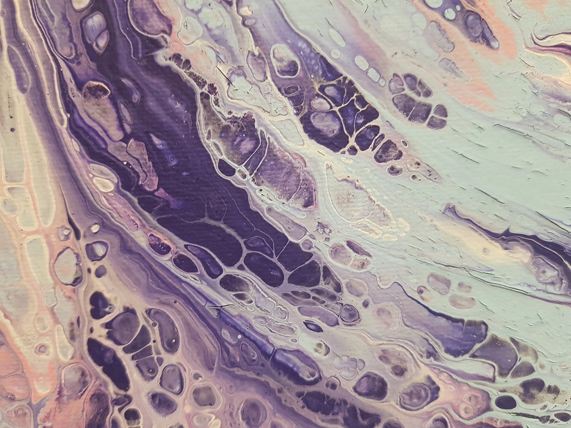 The calming color scheme in this one-of-a-kind piece juxtaposes beautifully with the fierce movement of the acrylic paints and the geometric lines and bubbles flowing throughout the painting. The color scheme includes light blue, dark blue-violet, pastel pink, light lavender, and warm grey hues; lightly textured with a crackle effect.