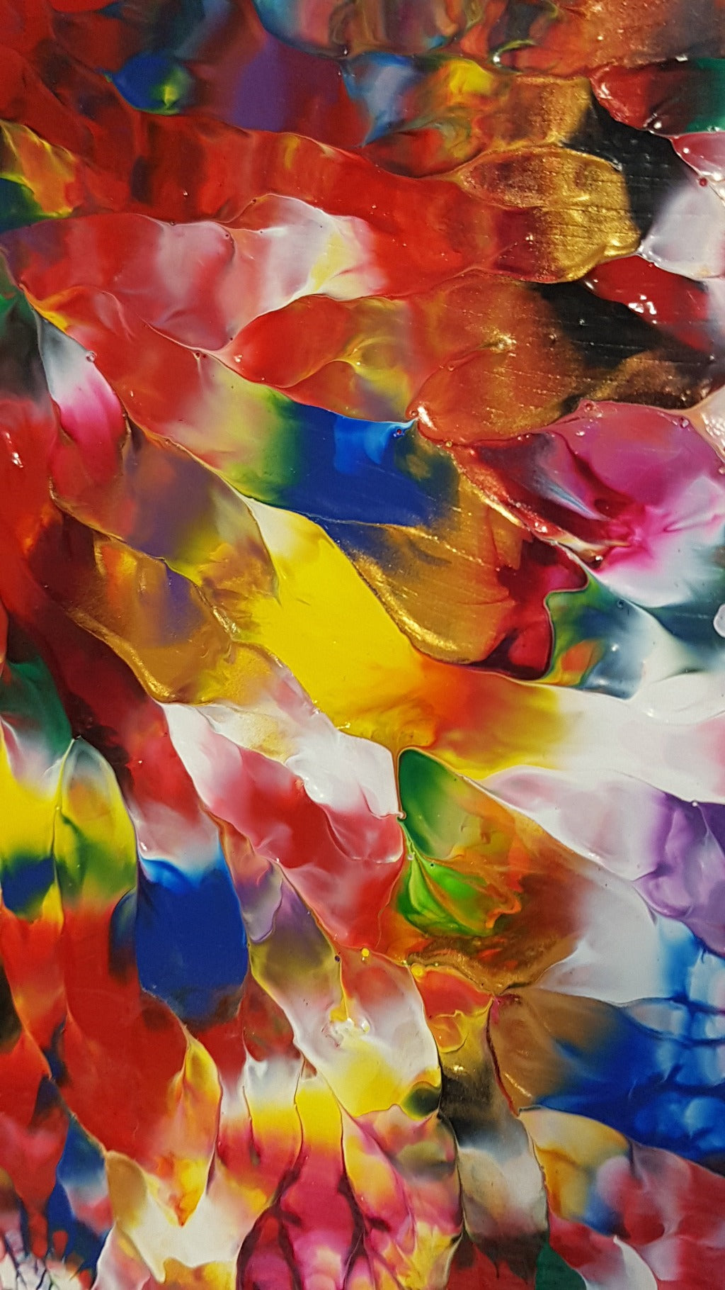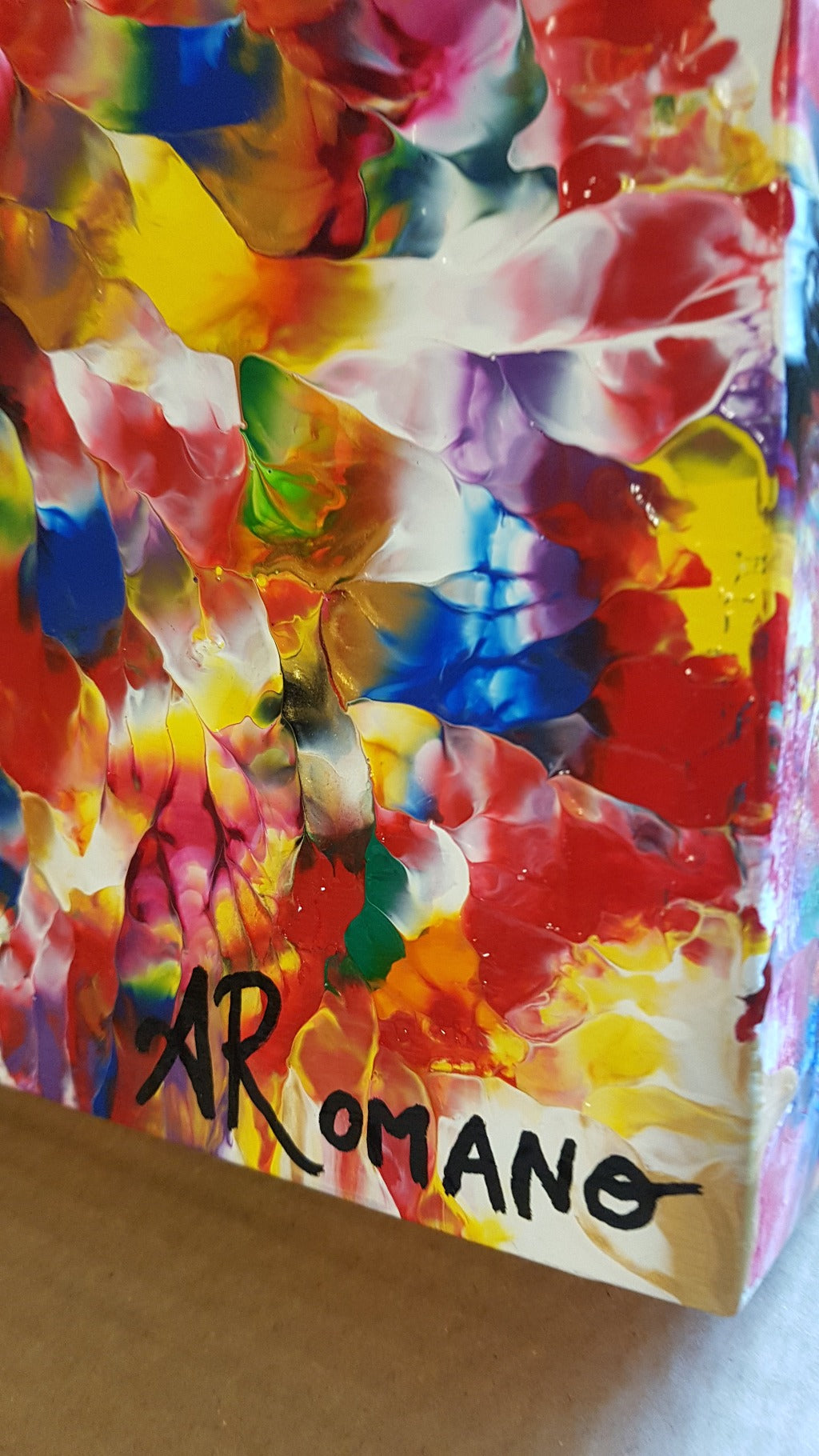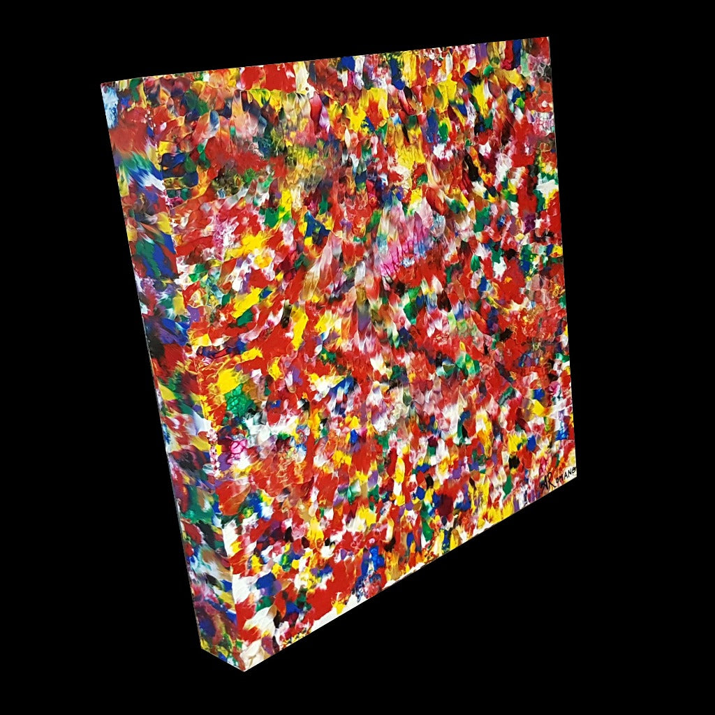 "Heart of a Rose" is an original abstract painting that radiates warmth, passion, and movement. The painting represents nature; all of the beautiful hues and blooming flower petals you see emerging in springtime. Layers of bold red, luminous yellow, vibrant green, and touches of blue and white create a vivid tapestry of color, echoing the depth and complexity found within the petals of a rose.