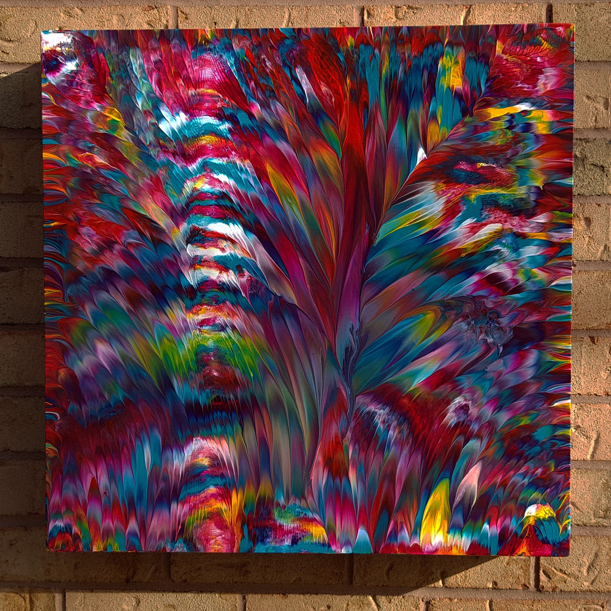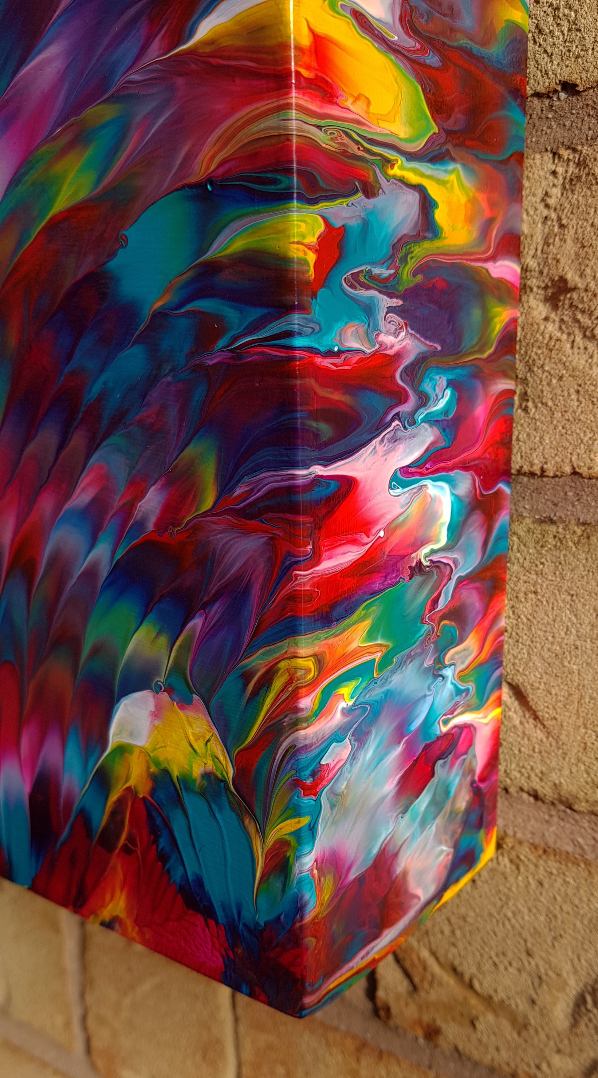 Inside Joseph's Dreamcoat IV is an abstract expressionism painting with liveliness, vibrant colours, unique texture, and a high gloss finish. The vibrant pinks and fuchsias contrast beautifully with the turquoise and teal tones. With a custom-made, deep edge canvas with 3-inch sides painted the same style as the front, this painting has that full wrap-around look that stands out from every angle.