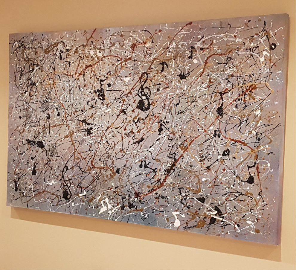 Unique mixed-media painting that was inspired by the freeing feeling you feel while listening to music; whimsical, flowing, music notes dance across the canvas. Black, white and metallic inks splash and drip throughout the piece; expressing the movement and passion you feel when you hear a catchy tune that brings you joy and touches your soul.Â