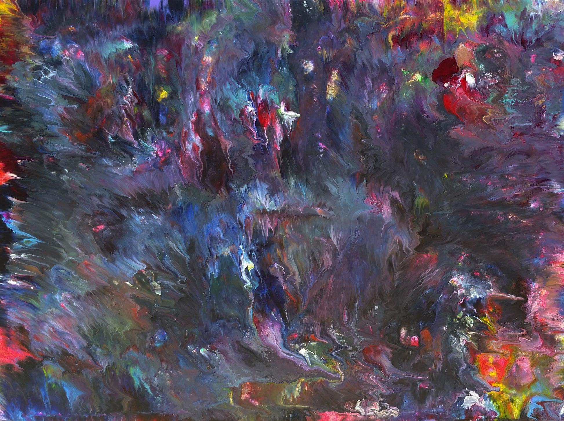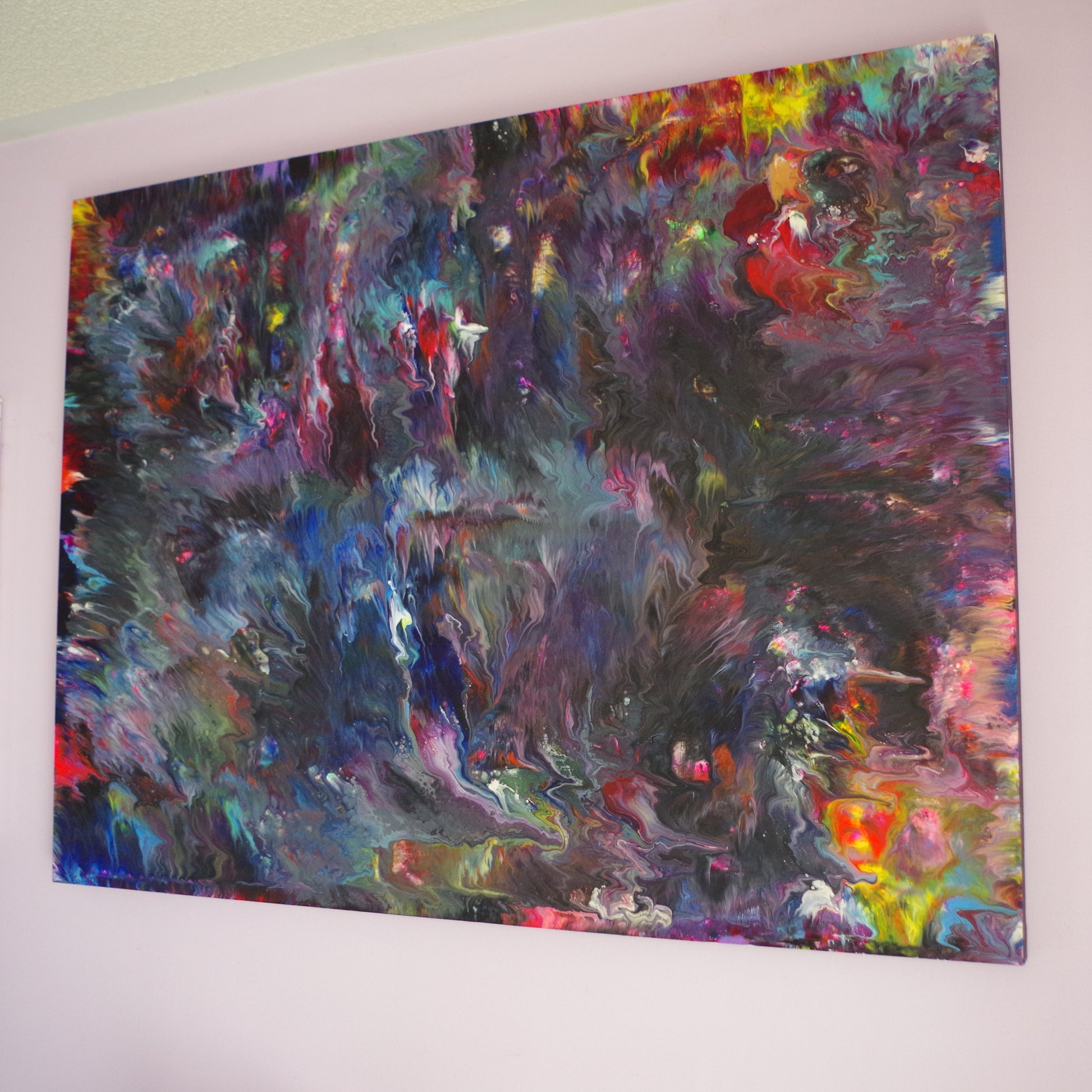 This one-of-a-kind abstract features expressive movement and bursts of vivid colours that resemble the dancing lights of the aurora borealis. Black, gray, blue, and violet colours blend with a refreshing turquoise accent, as well as yellow, orange, red, and pink, adding warmth and excitement to this unique artwork.
