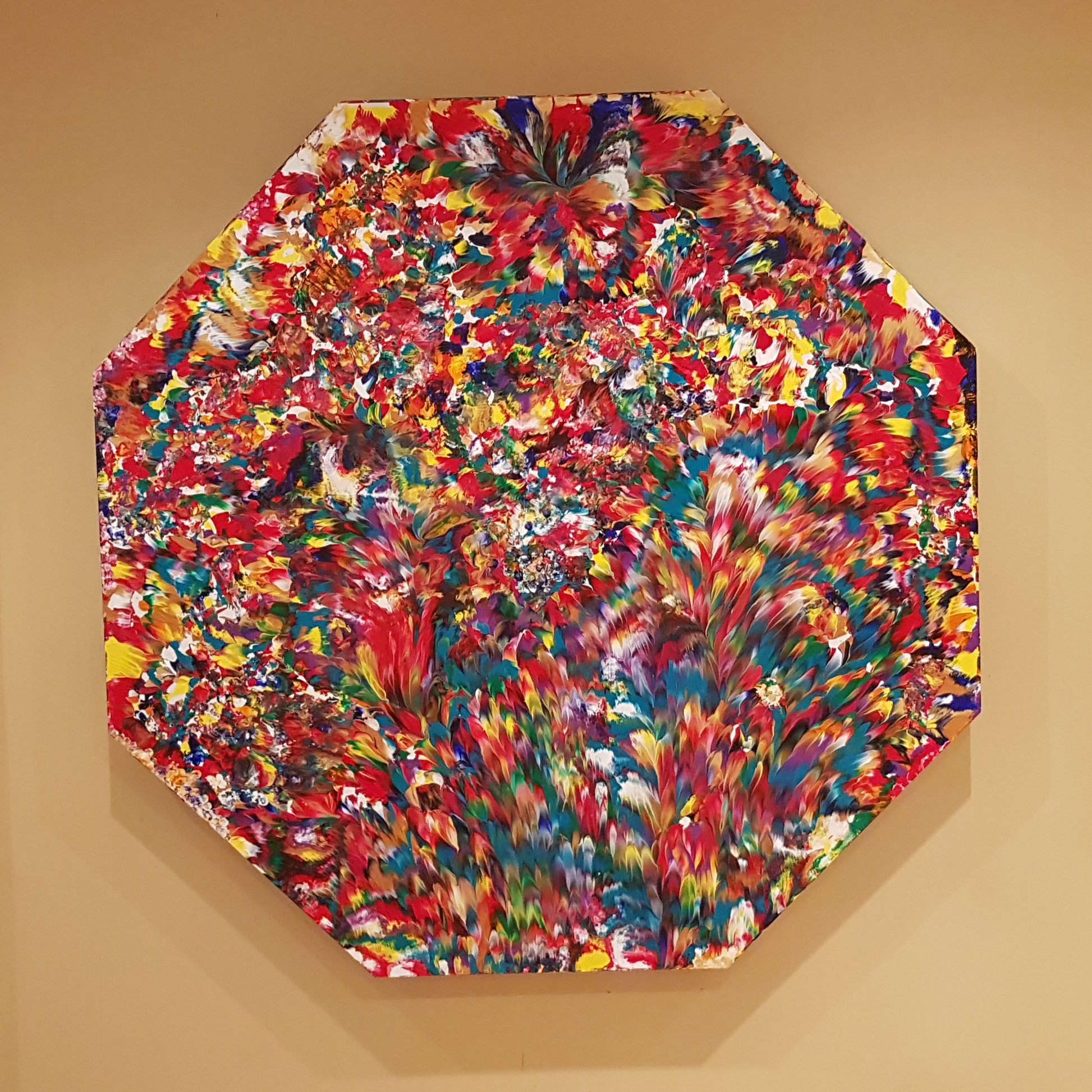 An octagon-shaped wood canvas was custom-made for this bold abstract expressionism painting. When I searched online for an octagon-shaped canvas, there were no options to buy anything on wood and in the large size that I wanted, so I had to ask my dad for help. Bright colours and a high-gloss finish are used to make the paint appear wet, as well as sharp lines, fierce movement, and amazing textures. All the sides are 3-inches thick and painted uniquely to make the piece pop from all viewing angles.