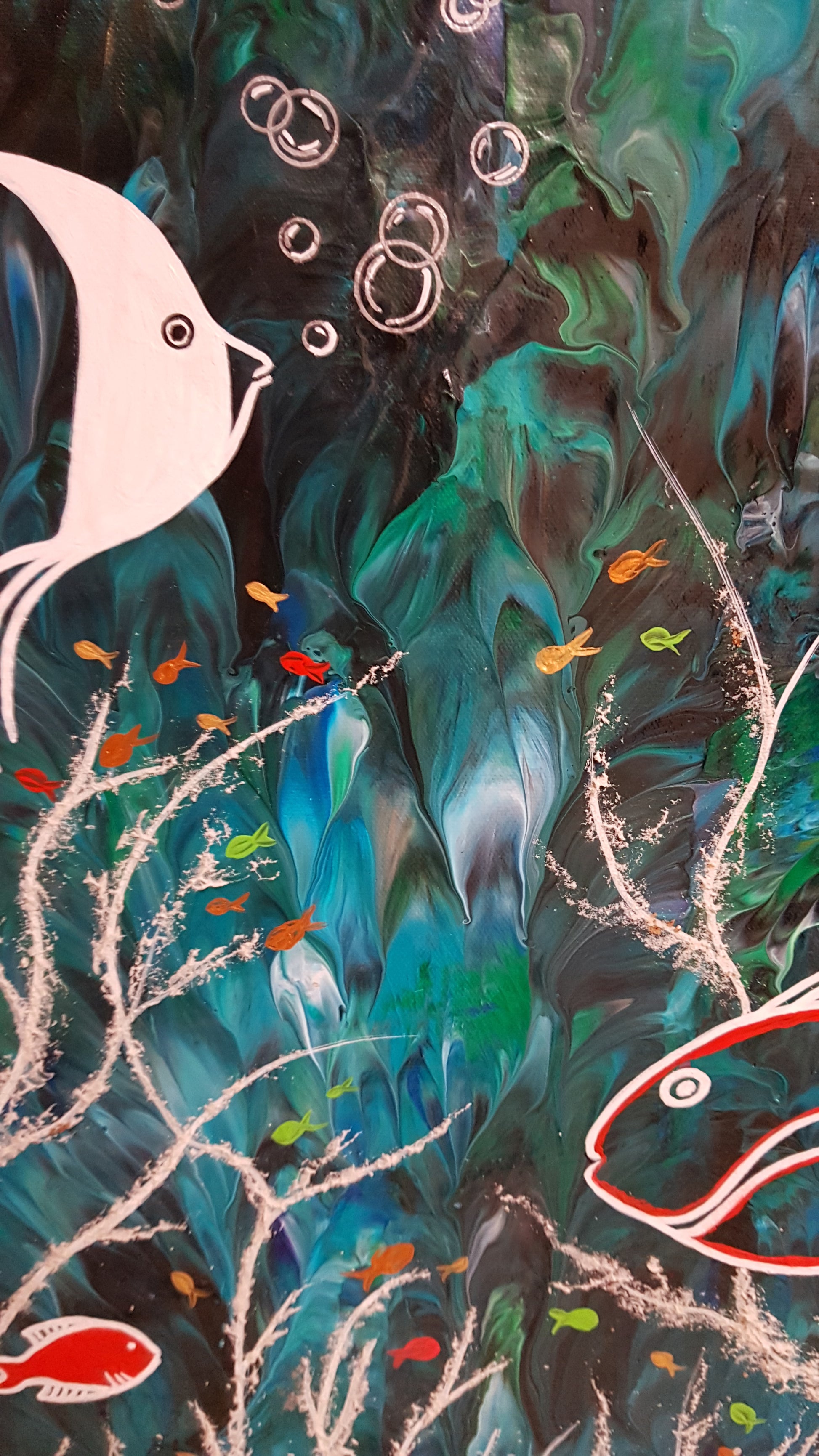 One-of-a-kind piece with an abstract background to mimic flowing water that's finished in high-gloss to make the paint appear wet with a scene of uniquely painted fish interacting in the sea. The white coral reef area is highly textured with bronze, copper, and gold rock formations at the bottom of the ocean and white textured coral that has a matte finish. Gold, green, and orange fish swirl around, and the white linework boldly stands out against the calming blue-green, teal, and black background, and the combination of unique textures and lustrous sheens add emphasis.