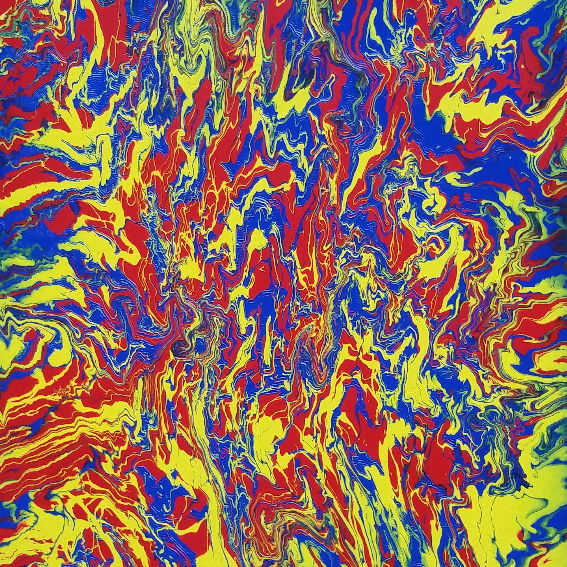 Primary Balance is a bold fluid painting that's a part of the "Primary Collection". The collection features vibrant high gloss enamel paintings that combine the three primary colors: blue, red and yellow. The sheen of this paint has a beautiful luster to it that looks amazing.