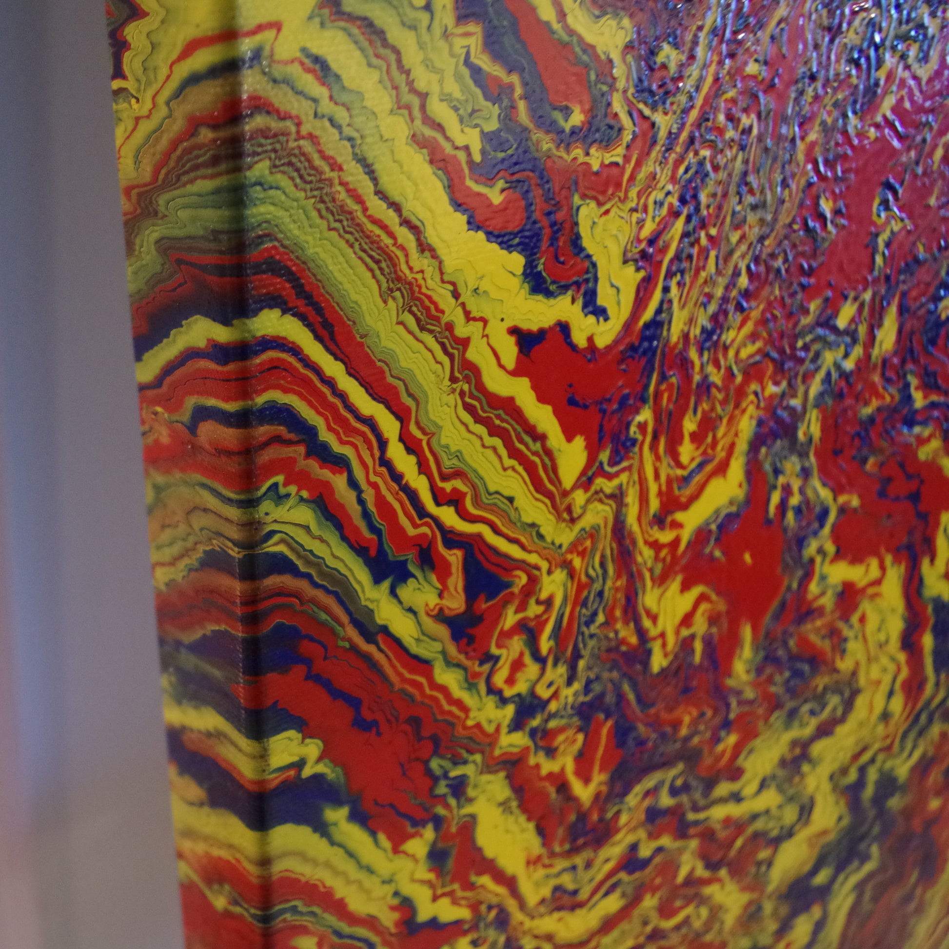 Bold abstract expressionism painting with vibrant primary colours; red, yellow, and blue. This original painting is a part of the "Primary Collection" which features one-of-a-kind statement pieces with a high gloss finish, spontaneous movement, and beautiful textures.