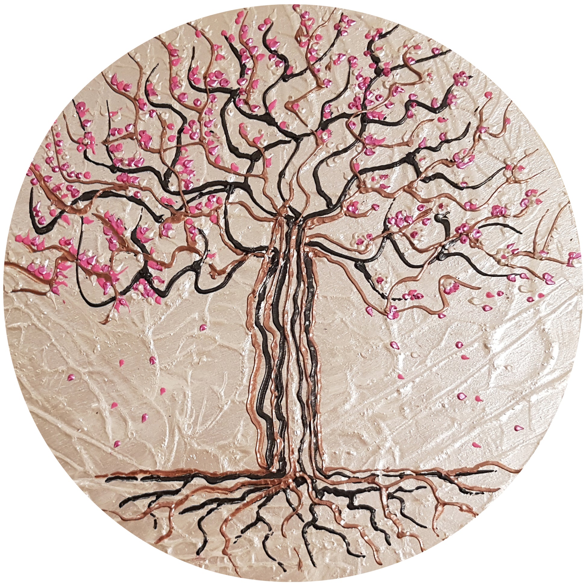 One-of-a-kind collector's piece created on a 10-inch wooden round canvas with 1.5-inch painted sides, this piece stands out as a sculptural work of art that brings elegance and meaning to any space. Both tactile and luminous, “Sakura” is designed to be treasured as a singular creation.