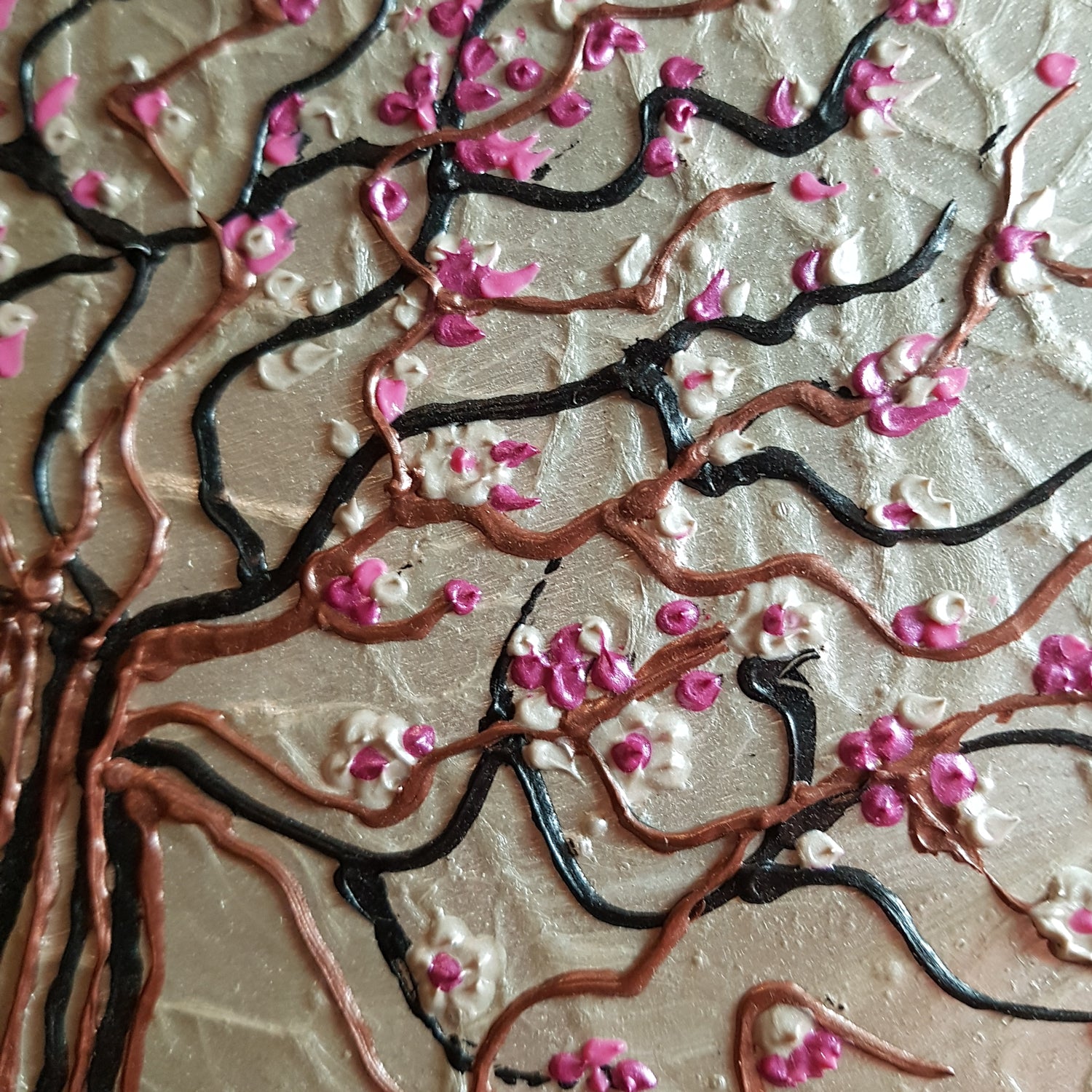 “Sakura” captures the fleeting beauty of cherry blossoms in a richly textured impressionist style. The veined, raised surface shimmers with a silvery background, while the trunk and branches are painted with bold black and metallic copper, adding depth and dimension. Layers of pink and white blossoms dance across the tree, blooming and falling gracefully — a timeless symbol of renewal, beauty, and the ephemeral nature of life.