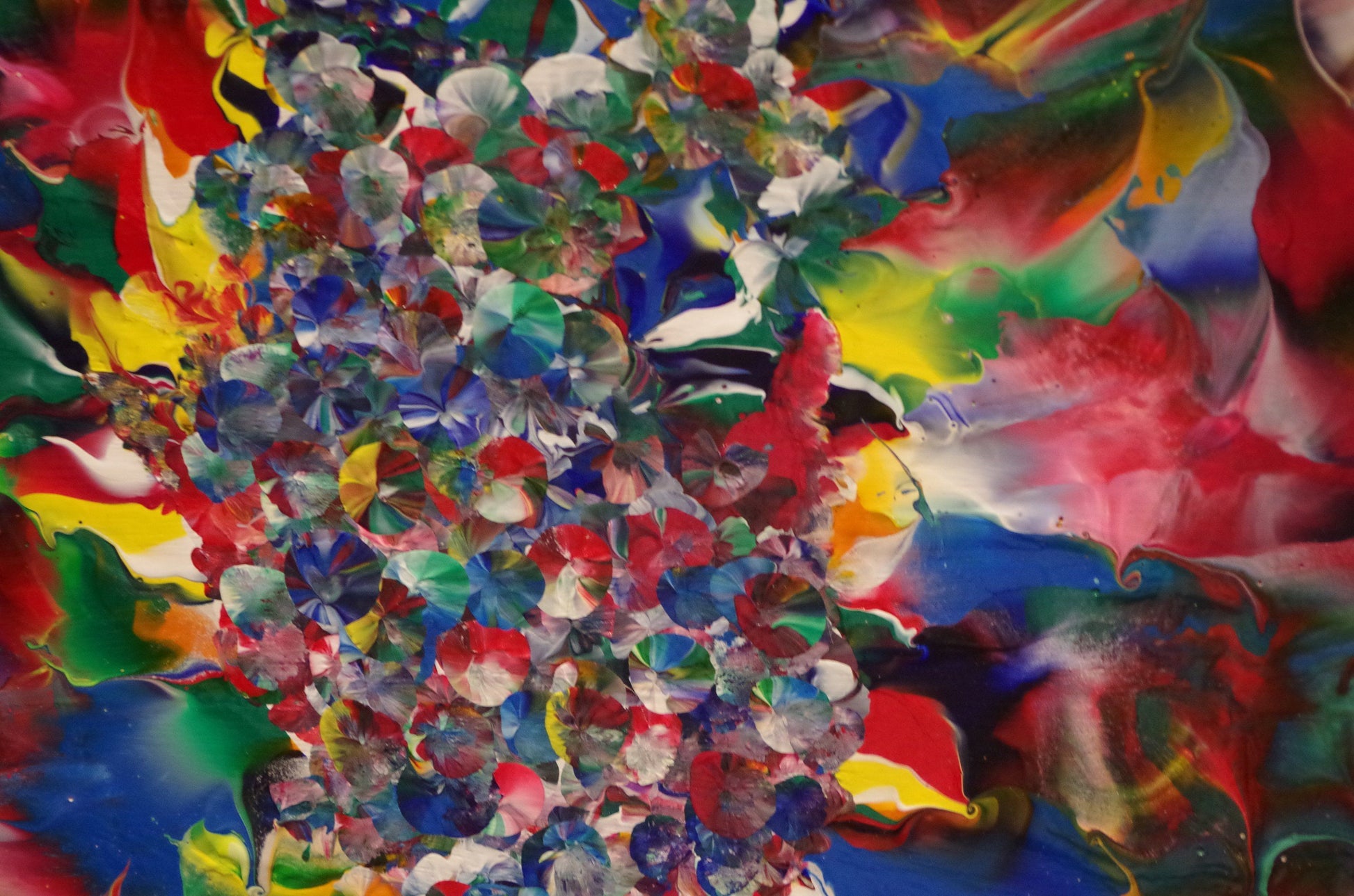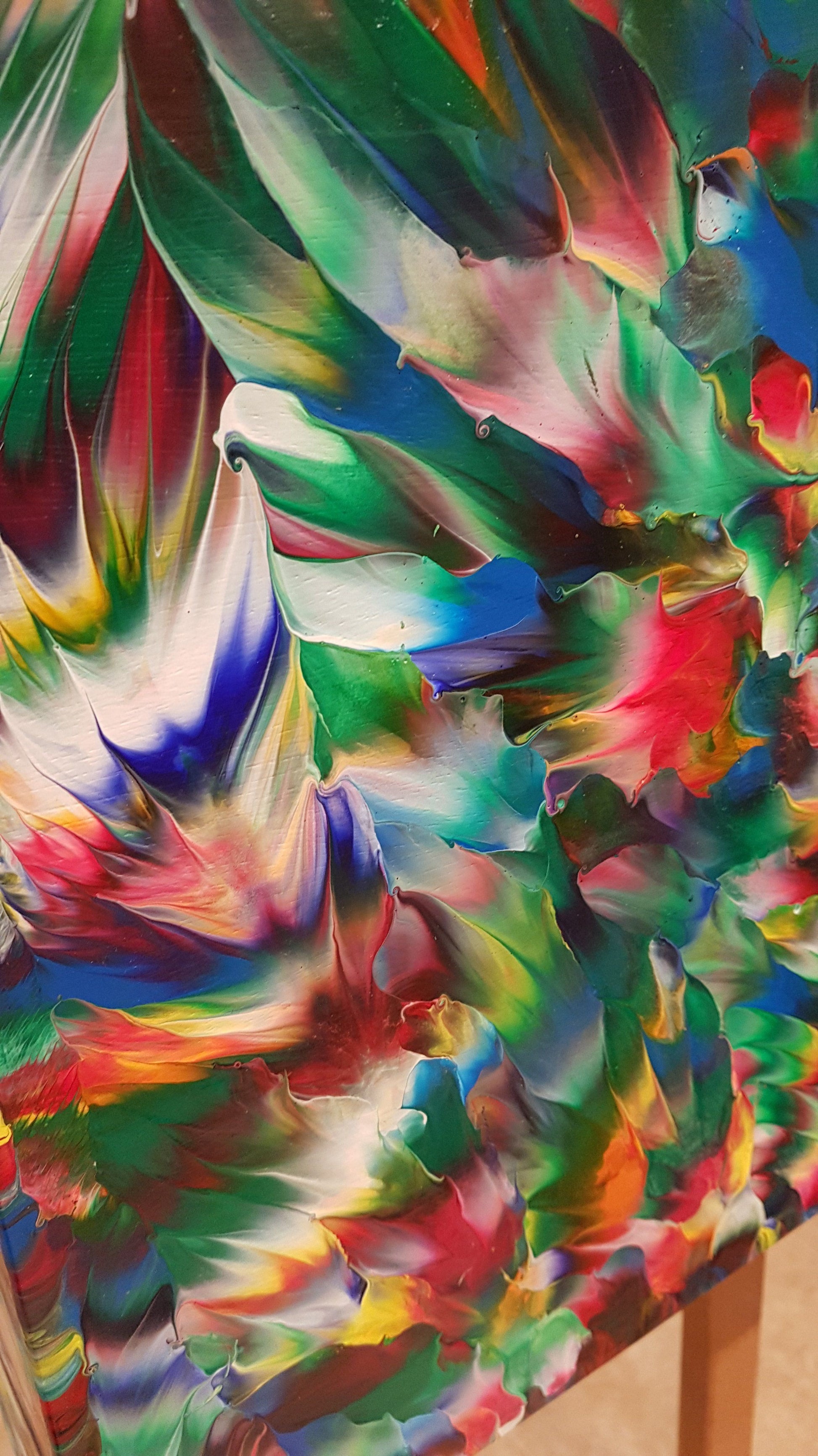 This unique painting is an expression of celebration with a beautiful juxtaposition of cool calming colors; sapphire blue, emerald green, and violet contrast against yellow, orange, and red; creating a feeling of excitement. Movement, texture, and a high-gloss finish create a stunning effect. I used high-quality acrylic paint and my signature "Feathery" Style to create fierce and striking brush strokes reminiscent of peacock feathers.