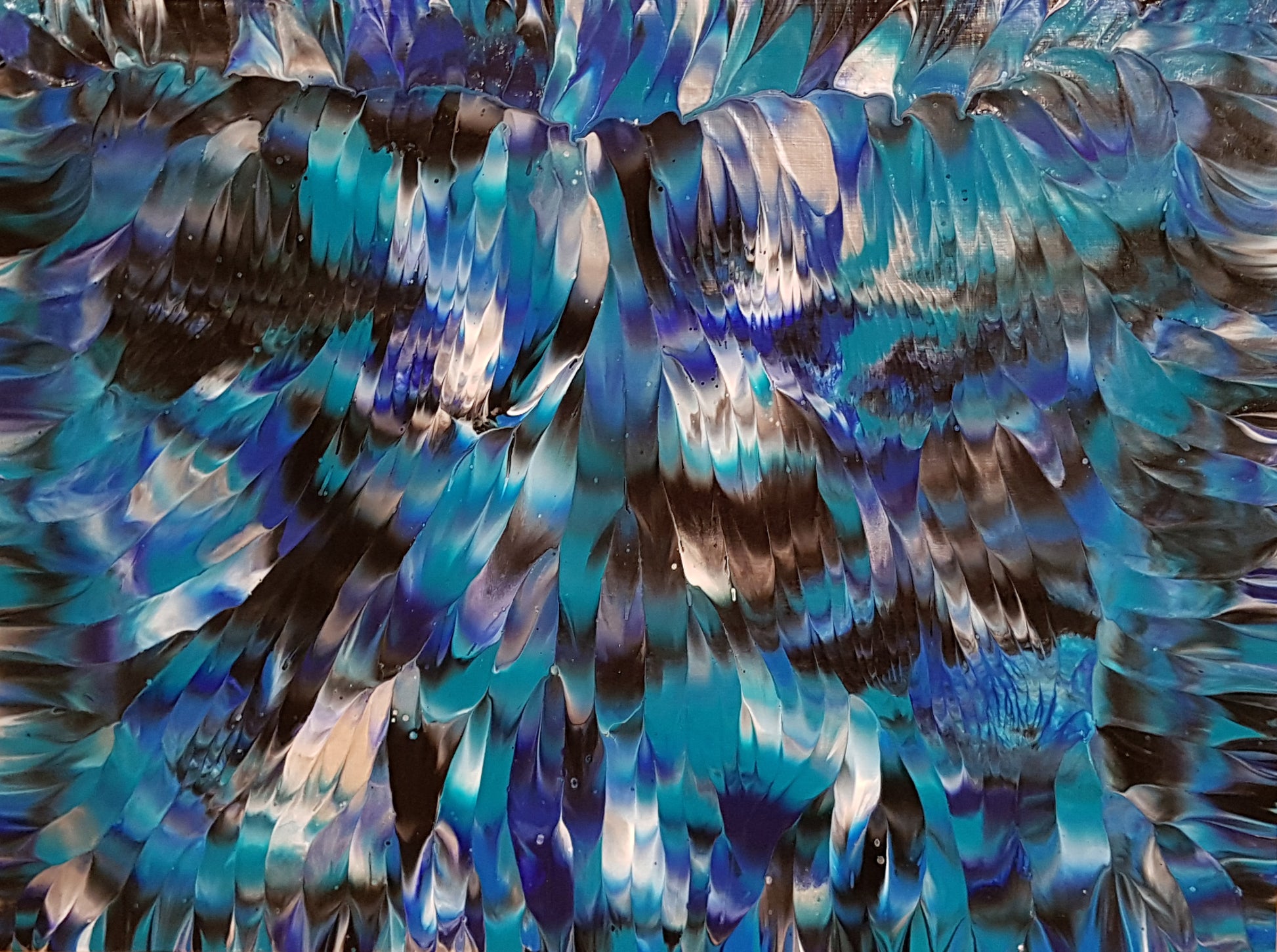 One-of-a-kind painting with an expressive and feathery movement resembling blue jay feathers that bear the cold sub-zero temperatures in winter. Featuring a rich "cool" color scheme of royal blue, turquoise, iridescent pearl white, and black, this painting is a unique piece with a high-gloss finish that looks wet and reflects light beautifully.