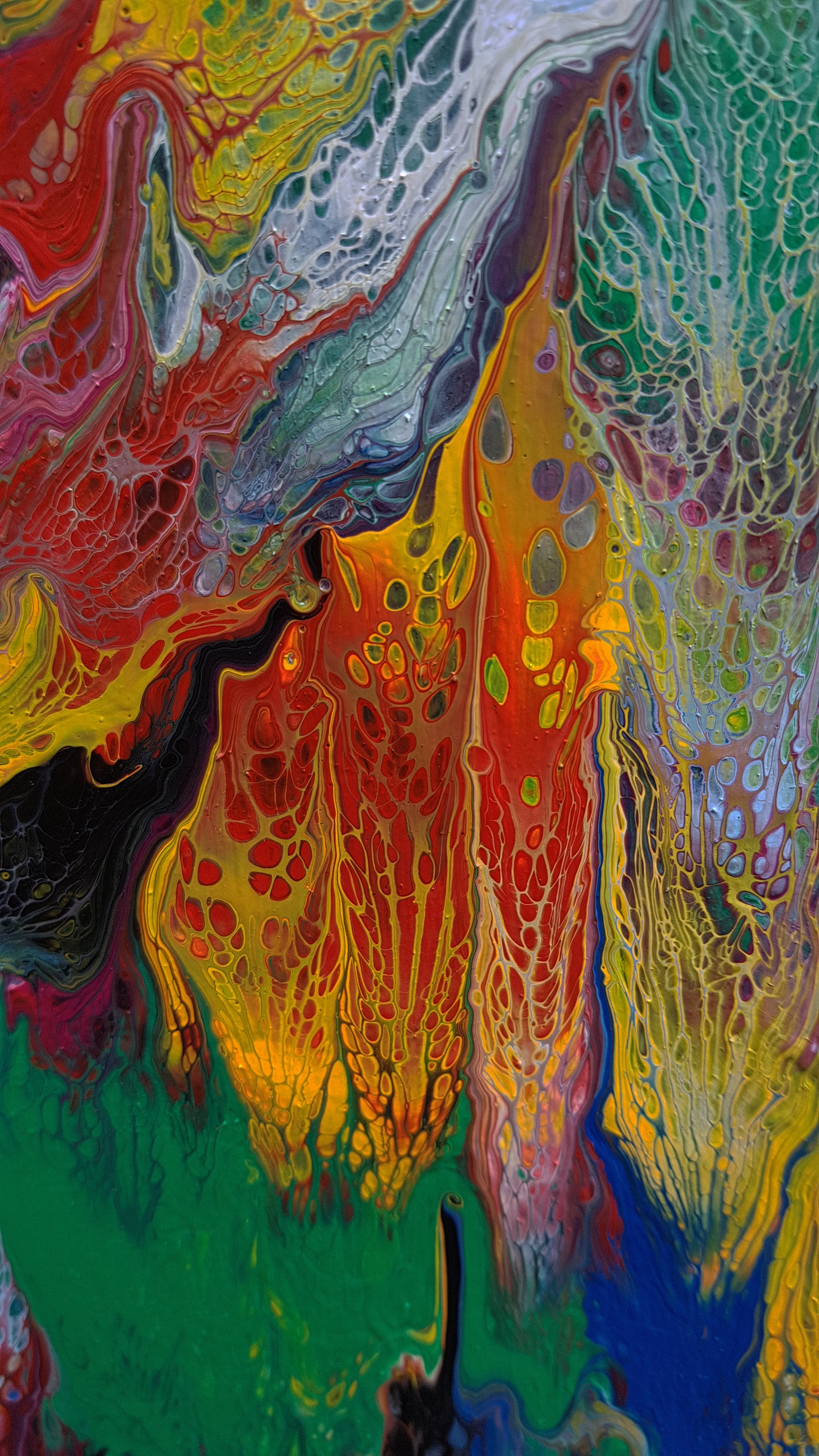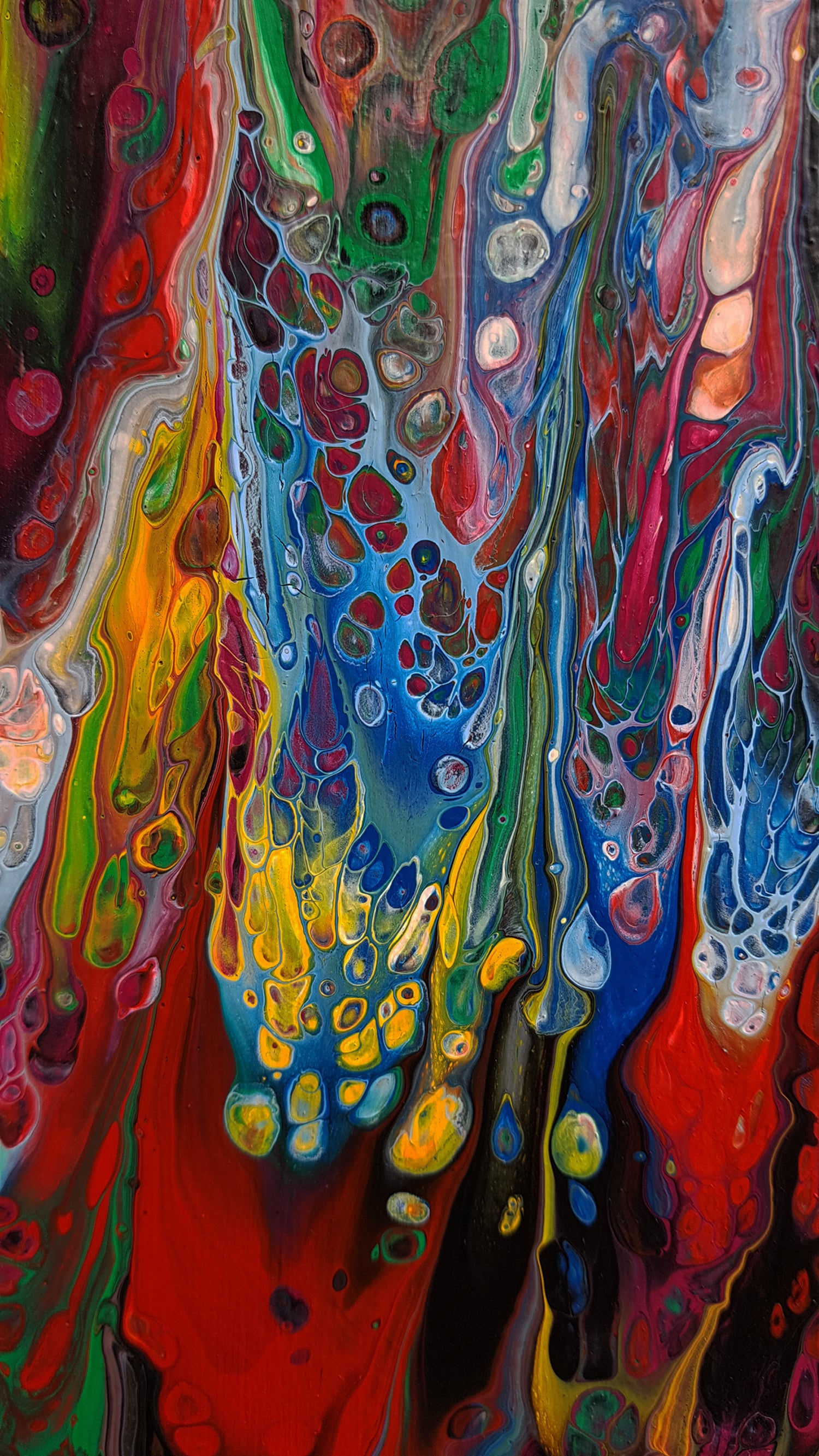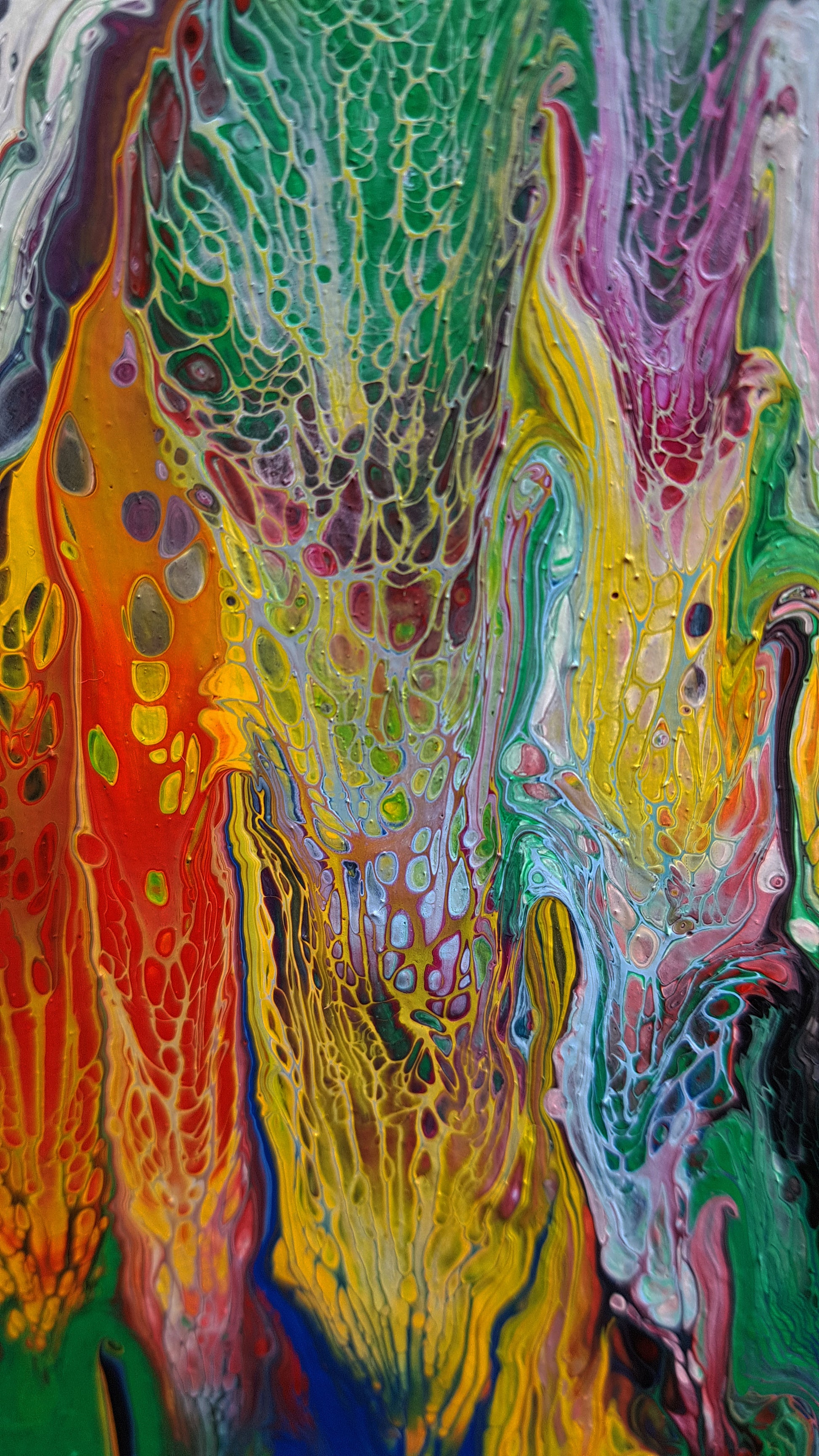 "Summer Falls" is a large-scale abstract acrylic painting (60" x 60" on wood panel) that immerses the viewer in a cascade of colour and motion. Layers of vivid reds, yellows, greens, and purples stream downward in powerful strokes, evoking the energy of a waterfall infused with the intensity of summer light. Up close, intricate textures and cellular patterns emerge — grainy, net-like details that create a sense of depth and life within the surface. This interplay between sweeping motion and delicate detail makes "Summer Falls" both commanding from a distance and endlessly engaging upon closer exploration.