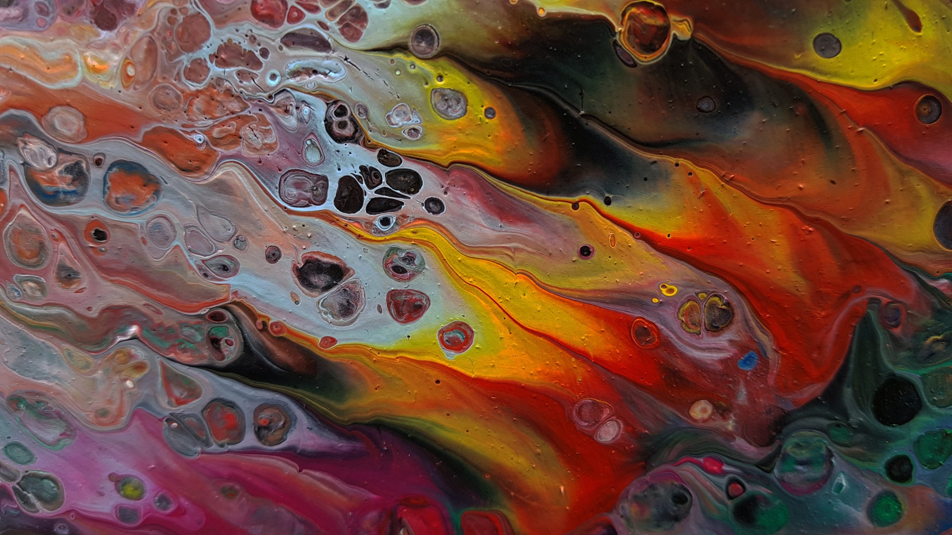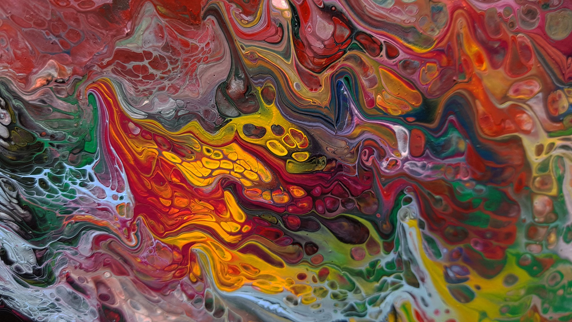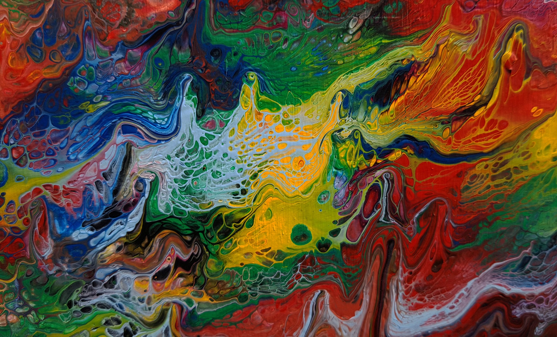 "Summer Falls" is a large-scale abstract acrylic painting (60" x 60" on wood panel) that immerses the viewer in a cascade of colour and motion. Layers of vivid reds, yellows, greens, and purples stream downward in powerful strokes, evoking the energy of a waterfall infused with the intensity of summer light. Up close, intricate textures and cellular patterns emerge — grainy, net-like details that create a sense of depth and life within the surface. This interplay between sweeping motion and delicate detail makes "Summer Falls" both commanding from a distance and endlessly engaging upon closer exploration.