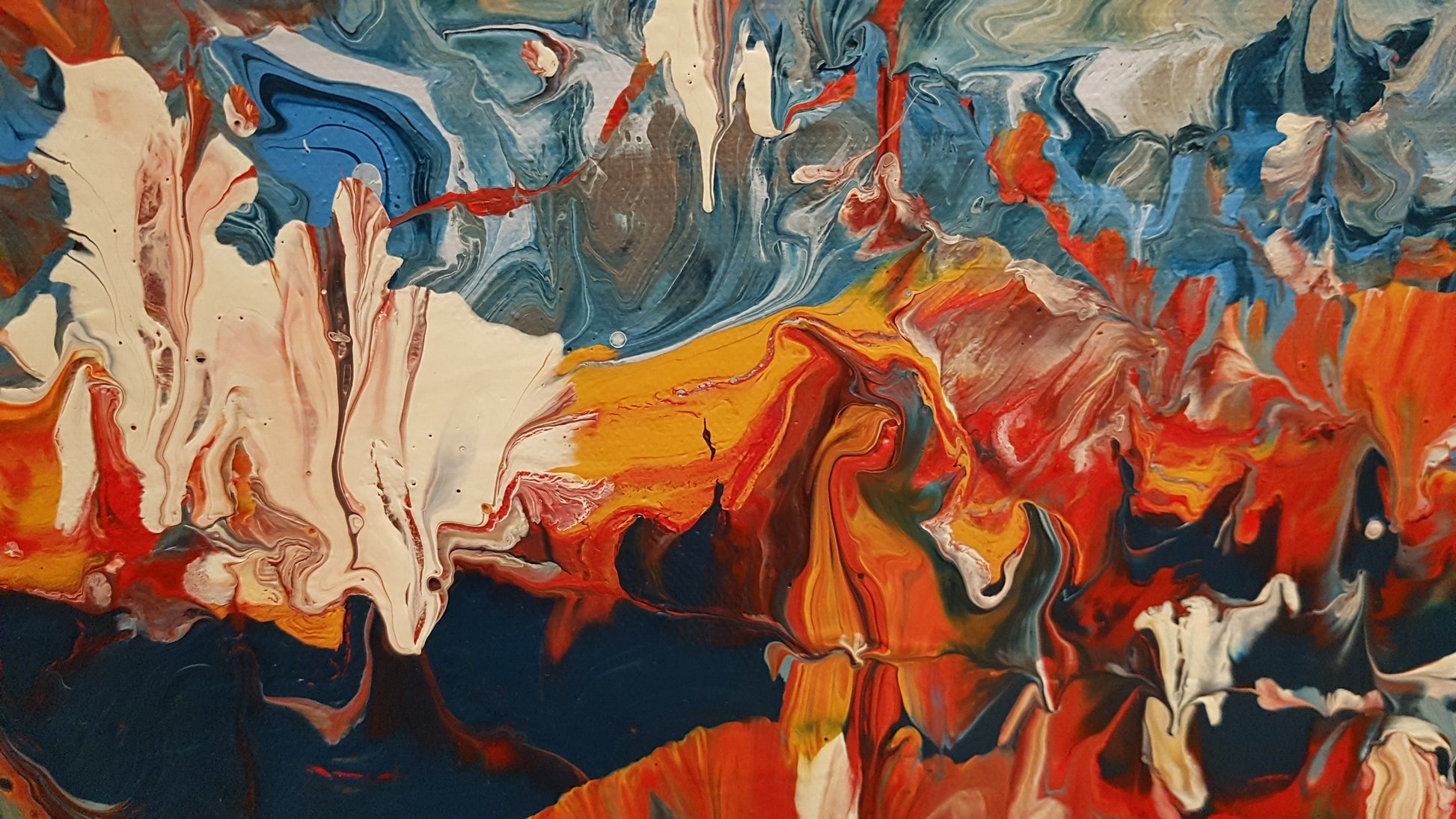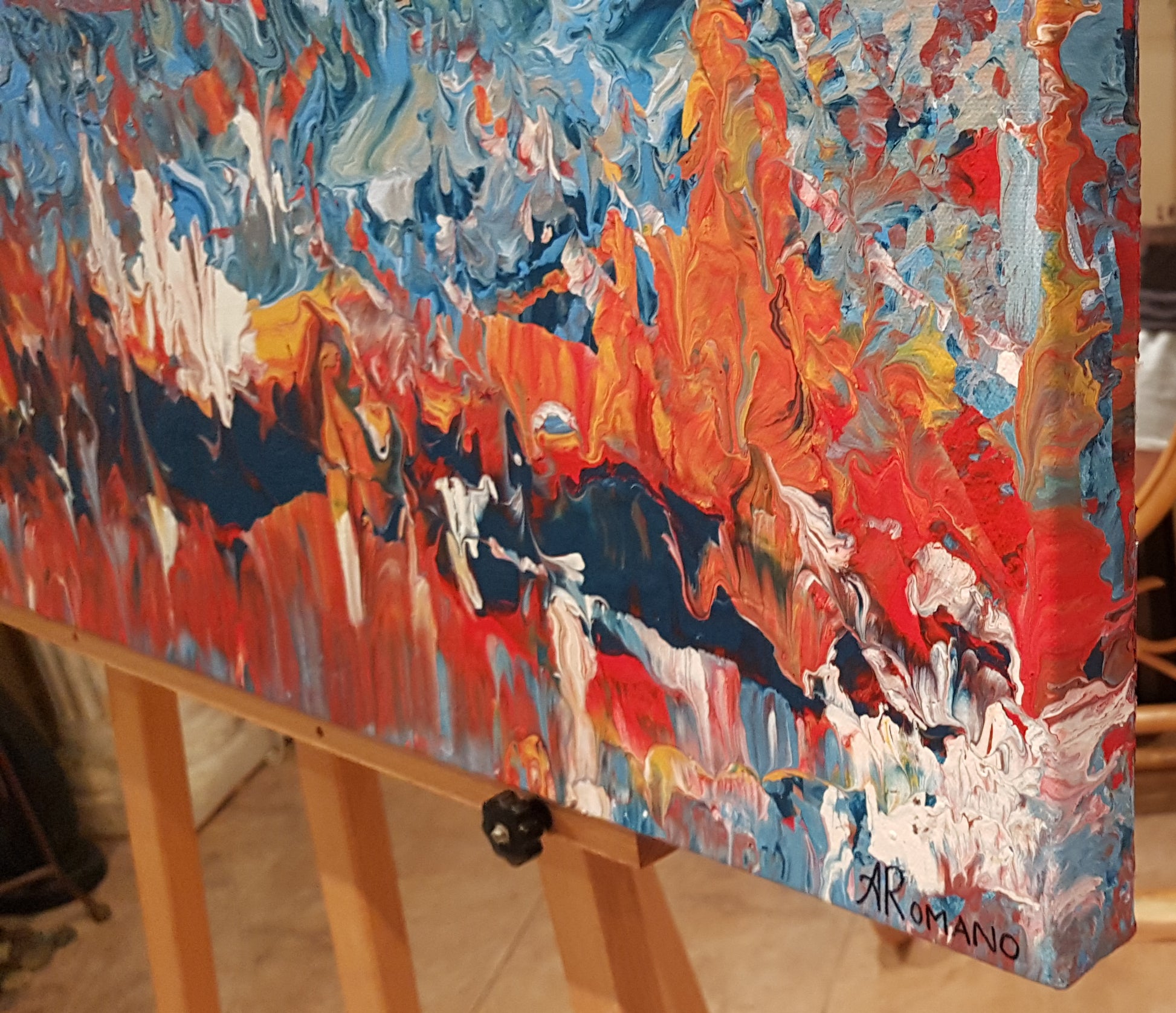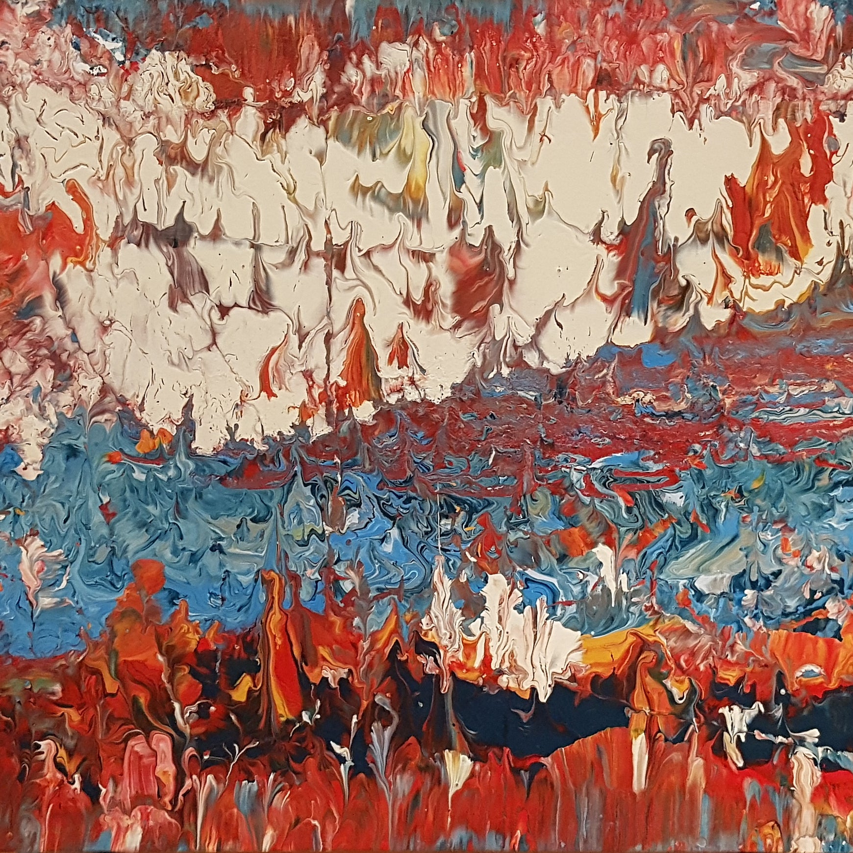 This one-of-a-kind abstract painting, titled "Wilderness", captures the powerful journey of transformation. Textured layers of acrylic in white, fiery reds and oranges, and deep blues flow together in dynamic movement, evoking both turbulence and renewal. The composition symbolizes resilience and inner strength—reminding us that beauty is often forged through pressure, just as diamonds emerge from struggle. "Wilderness" is both a visual statement and a contemplative piece, inviting viewers to reflect on perseverance and the shifting seasons of life.